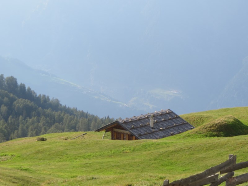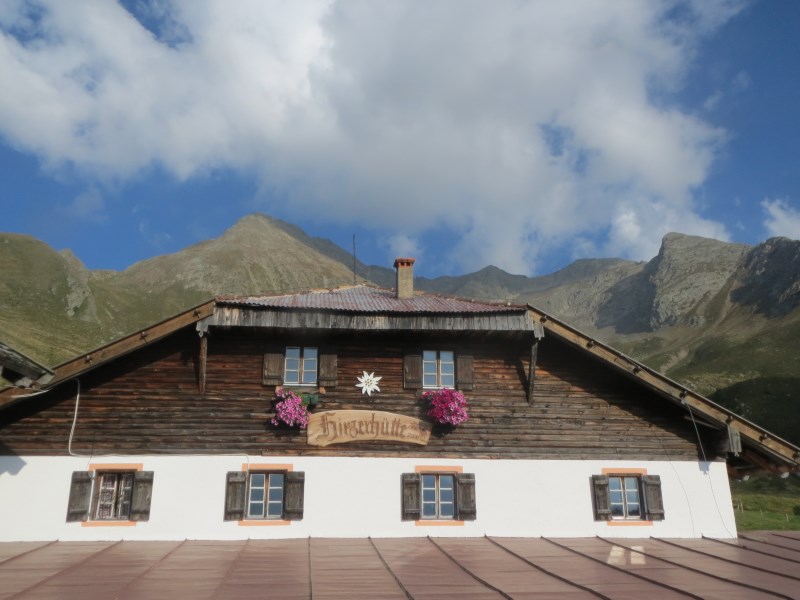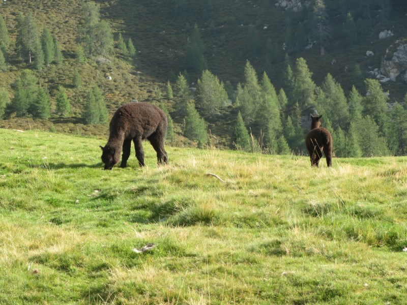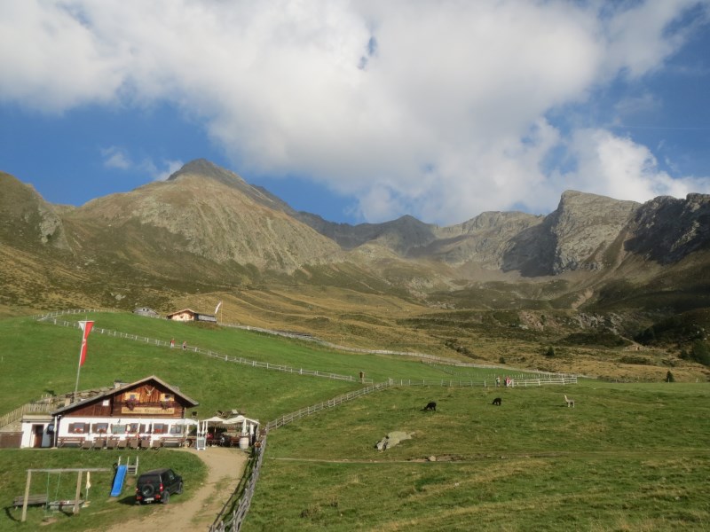 Il dislivello totale è di soli 226 metri, dai 1980 metri della partenza breve discesa e poi salita fino alla Tallneralm per poi risalire ancora fino a quota 2030 metri circa, poi si scende fino ai 1974 metri della Hintereggalm dove mangiamo alle 15.30, molto bella questa malga, dove ogni tavolo ha un corno di cervo e tutte le panche sono munite di coperta a quadrettoni, ottimo il cibo e cordiali i gestori.
