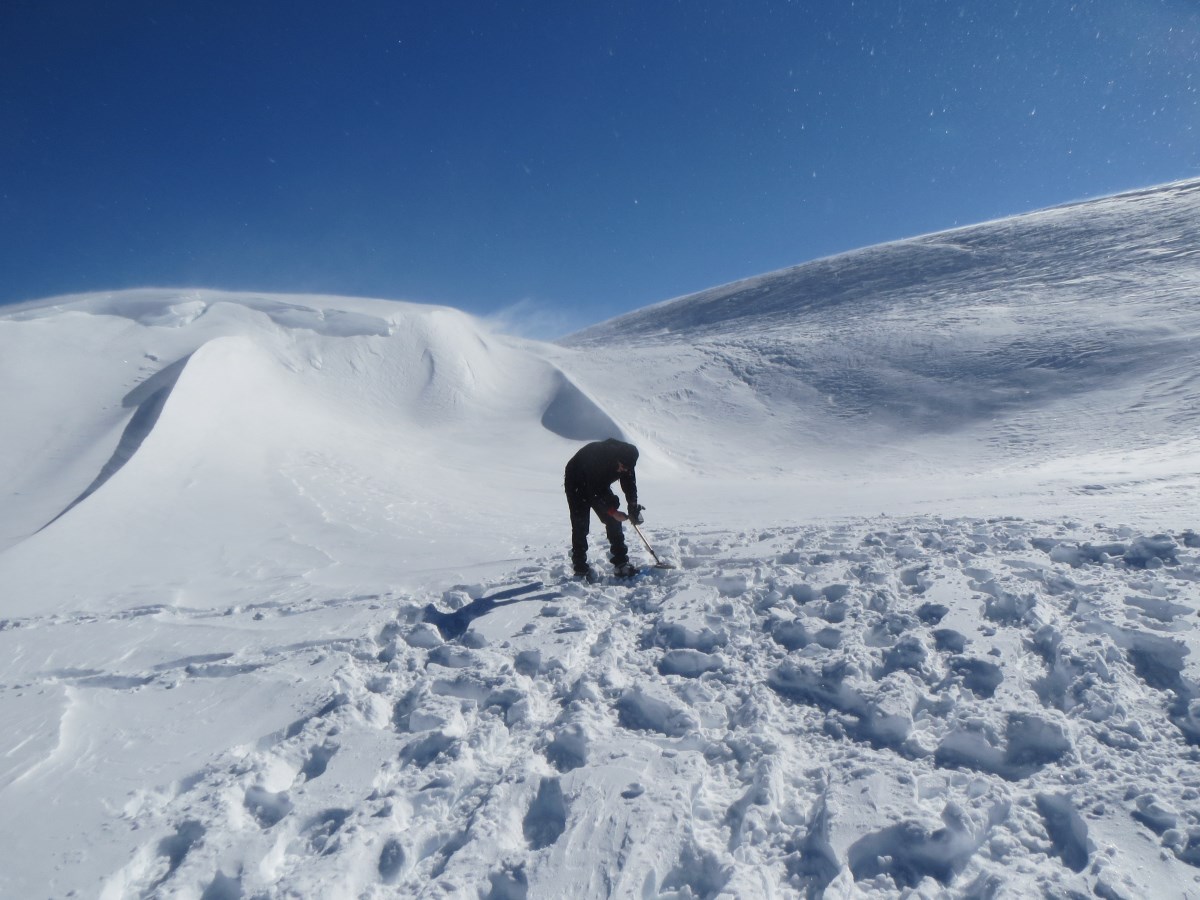 Arrivati al Rifugio e salutato gli amici che proseguivano alla volta della Fradusta per installare termometri sperimentali in tre nuove frost hollow, iniziamo l'opera di ricerca della stazione posta nella conca sotto il rifugio, questa volta anche con l'aiuto di un metal detector. La stazione meteo è posta su dei pali di acciaio, inizialmente a circa 3 metri, poi dopo le varie nevicate è stata alzata fino a sette metri e mezzo, ma con le abbondanti nevicate di quest'inverno è rimasta nuovamente sommersa, ipotizziamo circa 10 metri di neve sotto il rifugio,anche questa volta nonostante il metal detector e vari sondaggi con sonda da valanga e qualche ora di scavo non la troviamo.