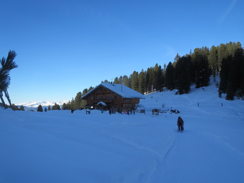 Bellissima giornata con cielo sereno e temperature finalmente in calo. Partiamo dopo un cappuccino a Malga Zannes (1685 metri) alla volta della Geisleralm (quota 1997 metri).abbiamo le ciaspole ma in realtà non ci serviranno visto che il sentiero è ben battuto. La neve è abbondante (circa 120 cm a quota 1950) e la vista sulle pareti nord delle Odle è da mozzafiato. Arriviamo alla Geisleralm intorno a mezzogiorno, giusto in tempo per prendere l'ultimo tavolo libero esterno, ci saranno 200 persone fuori e dentro è tutto pieno. Mangiamo molto bene, piatti della cucina tipica sud tirolese (uova speck e patate, stinco al forno, maccheroncini alla pastora). Ripartiamo verso le 14.20 (prima saliamo sulla piana sopra il rifugio dove ci sono delle bellissime baite proprio ai piedi dei ghiaioni che scendono dal Sass Rigais) facendo un sentiero nel bosco, diverso da quello dell'andata, passando per la malga Dusler. Arriviamo al parcheggio a malga Zannes alle 16.00 circa.