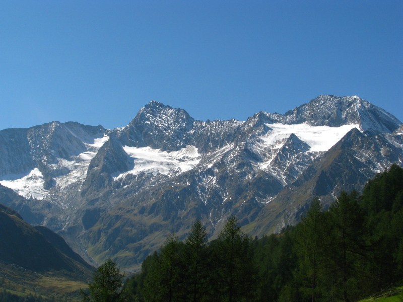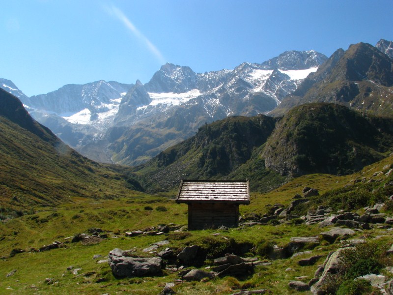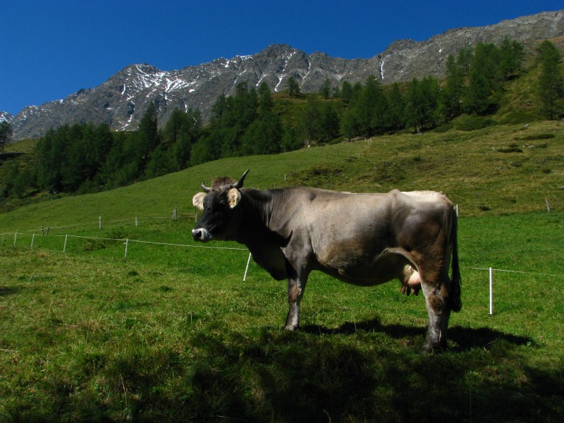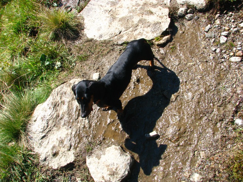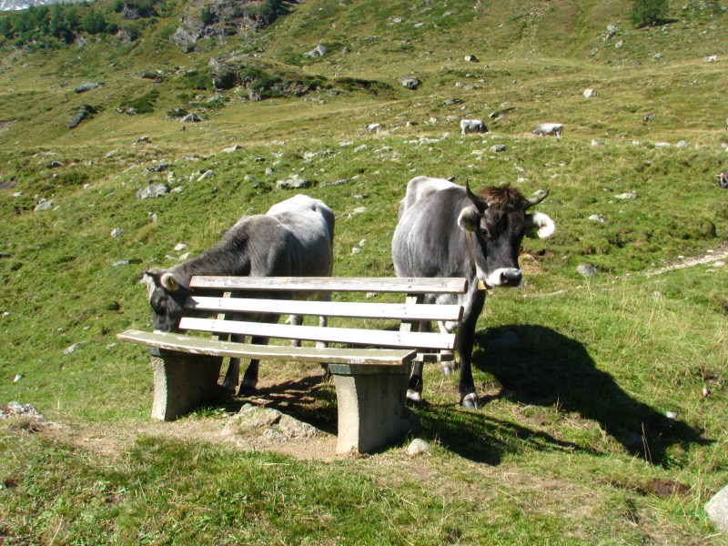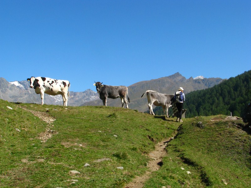 Siamo partiti dal parcheggio posto a quota 1920 metri (c'è un cartello su uno dei tornanti che porta a Passo Rombo) che indica la Seeberalm, da lì siamo scesi fino a quota 1840 alla Seeberalm, poi  si inizia a salire senza grossi strappi in mezzo ai pascoli (mucche ovunque con "torte" ovunque), alcune manze sono particolarmente incuriosite da Carlotta (bassotto dal pelo focato, una salsiccia con le zampe) e tentano anche di seguirla. Arriviamo in meno di un'ora al lago Seebersee, posto in una conca (quota 2059 metri)  ai piedi di montagne alte oltre 3000 metri (dai 3037 metri del Racinesspitz ai 3399 dello Spitz e c'è una cima che arriva a  3405 metri, queste ultime due confinano con l'Austria), con dei bellissimi ghiacciai, la neve caduta in settimana ricopre ancora in parte le cime.