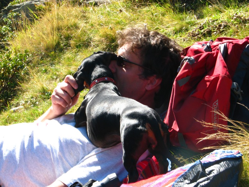 Siamo partiti dal parcheggio posto a quota 1920 metri (c'è un cartello su uno dei tornanti che porta a Passo Rombo) che indica la Seeberalm, da lì siamo scesi fino a quota 1840 alla Seeberalm, poi  si inizia a salire senza grossi strappi in mezzo ai pascoli (mucche ovunque con "torte" ovunque), alcune manze sono particolarmente incuriosite da Carlotta (bassotto dal pelo focato, una salsiccia con le zampe) e tentano anche di seguirla. Arriviamo in meno di un'ora al lago Seebersee, posto in una conca (quota 2059 metri)  ai piedi di montagne alte oltre 3000 metri (dai 3037 metri del Racinesspitz ai 3399 dello Spitz e c'è una cima che arriva a  3405 metri, queste ultime due confinano con l'Austria), con dei bellissimi ghiacciai, la neve caduta in settimana ricopre ancora in parte le cime.
