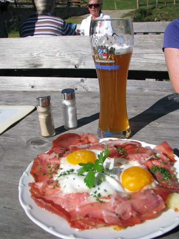 Al lago ci sono anche tre pescatori ma nella mezz'ora che rimaniamo lì non pescano nulla, anche se qualche pesce salta nell'acqua. Ripartiamo verso Est ed il sentiero sale dolcemente fino a quota 2147 metri per poi scendere alla Oberglanegg, una malga posta a quota 2060 metri (si si può arrivare a piedi in 10 minuti da uno dei tornanti che portano al Passo Rombo). Qui mangiamo ottimamente Knodel e Spiegeleier ed una torta alla ricotta. Dopo l'abbuffata scendiamo al parcheggio a riprendere l'auto.