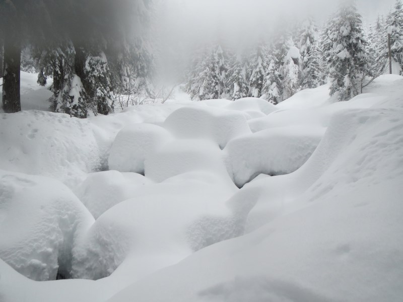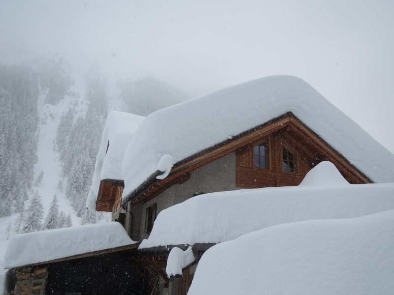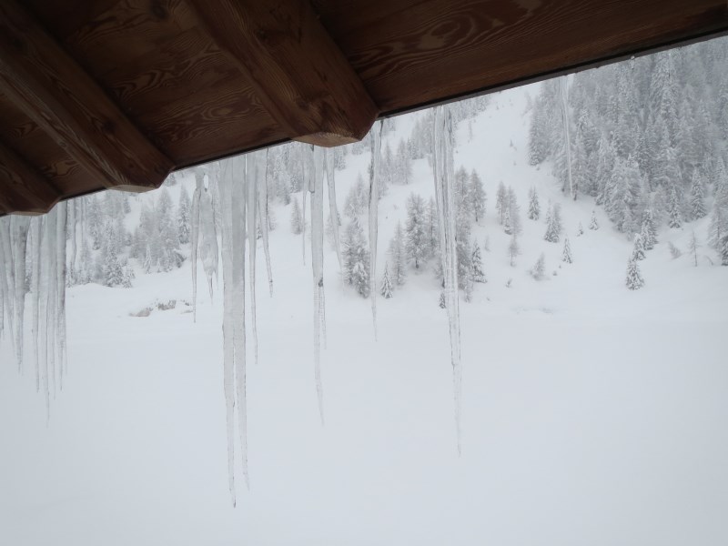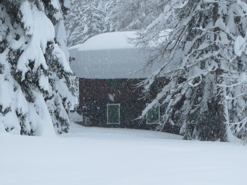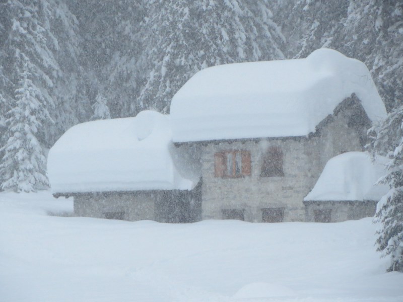 Partiti nel primo pomeriggio dal parcheggio posto nella piana che ospita la Zangola, raggiungiamo il rifugio con le ciaspole dopo un'oretta di cammino in tutta tranquillità (dislivello 155 metri circa). La nevicata ci accompagnerà per quasi 24 ore consecutive. La neve al suolo è pari a circa 2 metri e le foto ne sono testimoni.