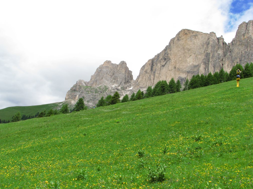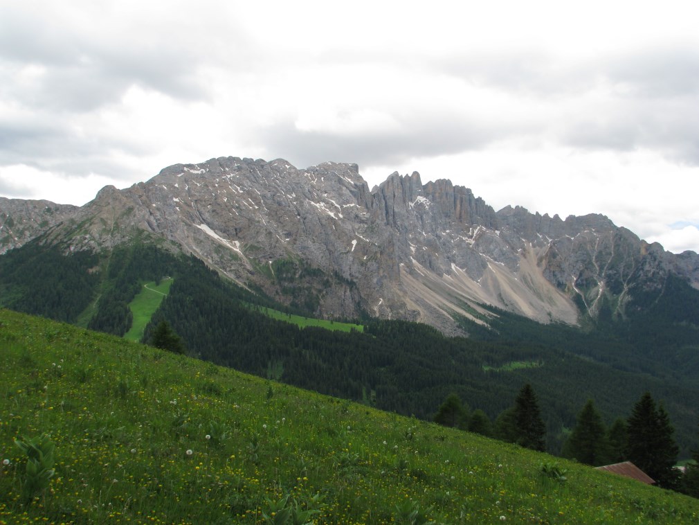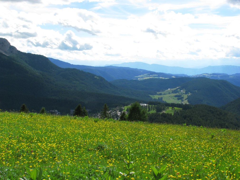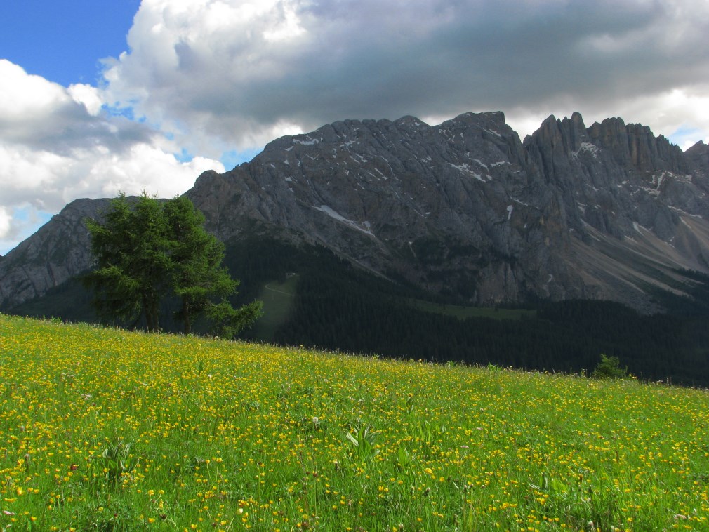 Prati fioriti bellissimi fino a Carezza, alle nostre spalle il Gruppo del Catinaccio con la parete verticale della Roda di Vael.