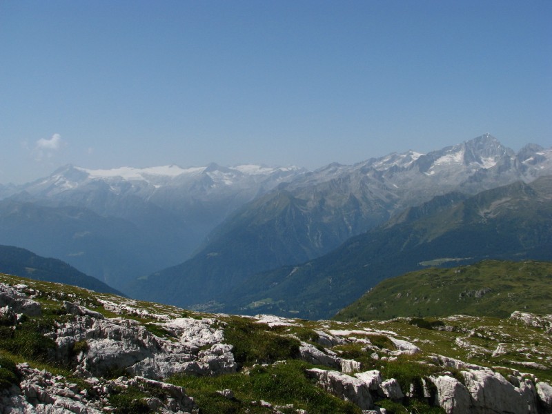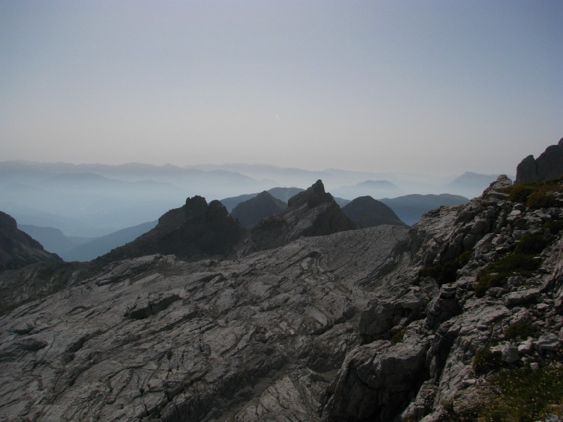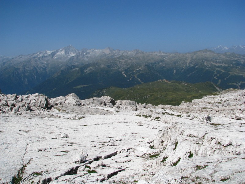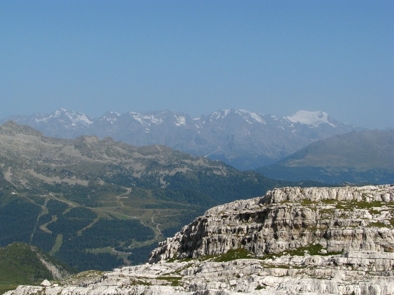 Ritrovo alle 07.00 in quel di Roncone, partenza da Campo Carlo Magno alle 08.40 circa, raggiungendo comodamente grazie agli impianti i 2438 metri del rifugio Grosté. Da lì raggiungiamo il passo del Grosté a quota 2500 metri e prendiamo a destra verso la Cima Grosté, le segnalazioni sono piuttosto scarse e nulla indica la Cima Roma, ad ogni modo saliamo fino a quota 2680 metri all'attacco del Sentiero Benini, una via ferrata fatta qualche anno fa con Andrea ed Antonella, da lì il panorama verso est è incredibile (peccato per la foschia) si vede dalla Paganella alla Marzola, al Gruppo di Cima Dodici alla Vigolana, Panarotta, Fravort Gronlait ecc.... Da lì torniamo indietro visto che non c'è alcuna indicazione (nonostante una signora ci avesse fornito informazioni piuttosto dettagliate ma inesatte), probabilmente il sentiero verso i 2837 metri di cima Roma saliva dalla conca posto sotto la Cima Grosté, in sostanza la valle che sale dalla Malga Flavona, vabbré ci riproveremo in futuro. La vista verso ovest invece è strepitosa si va dal Carè Alto al Cevedale, molta meno foschia verso ovest rispetto ad est.