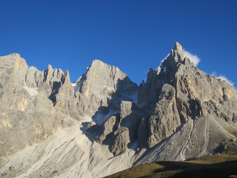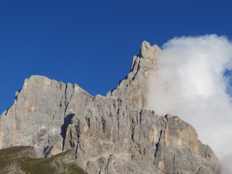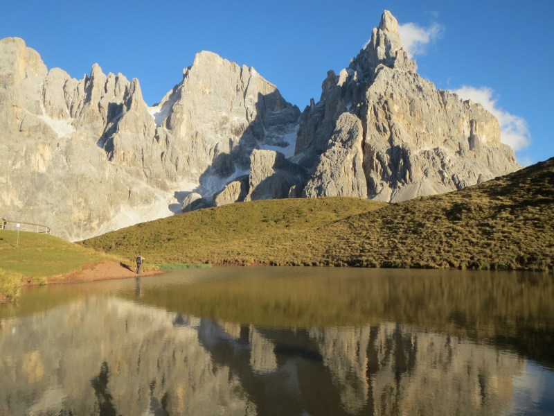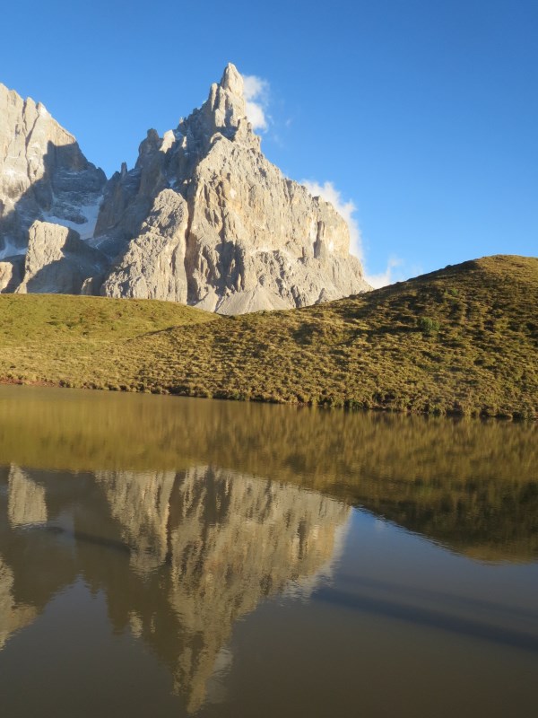 Partiamo quindi alla volta di Passo Rolle dove scopriamo che la strada che porta ai 2.200 metri della Baita Segantini è liberamente transitabile in auto, lì ci attenderà un paesaggio mozza fiato, la vista sul Mulaz, Vezzana e Cimon della Pala ci toglie il respiro, ci commuove. Facciamo anche delle belle foto alla Pale riflesse in un laghetto.