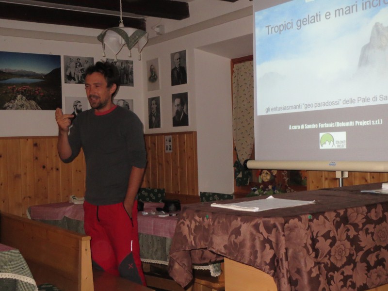 Sandro Furlanis, socio fondatore di Dolomitiproject: ha esposto un'interessante ed appassionata relazione denominata "Tropici gelati e mari incrodati, gli entusiasmanti geo-paradossi delle Pale di San Martino.