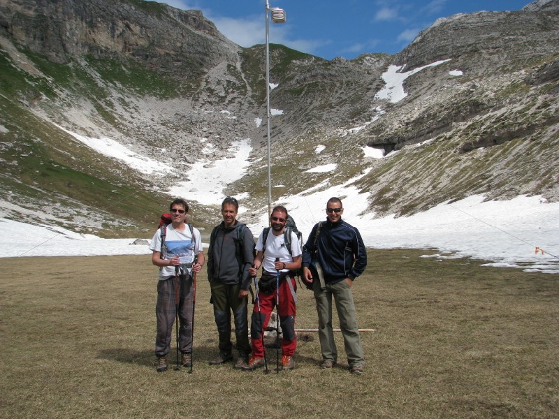 Dopo aver saluto il gestore e scattato qualche foto, siamo partiti alla volta di Pozza Tramontana (chiamata dal gestore “il Campo da Calcio”), 400 metri in discesa su sentiero piuttosto impervio e non segnato. Lì Bruno e Valter hanno calato il palo di sostegno, smontato lo schermo solare Davis e recuperato il datalogger Cryotemp.