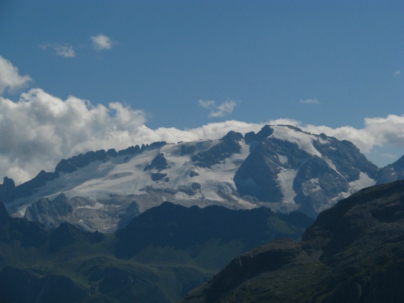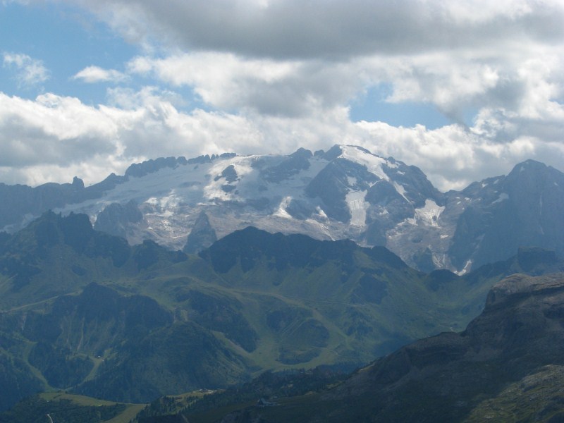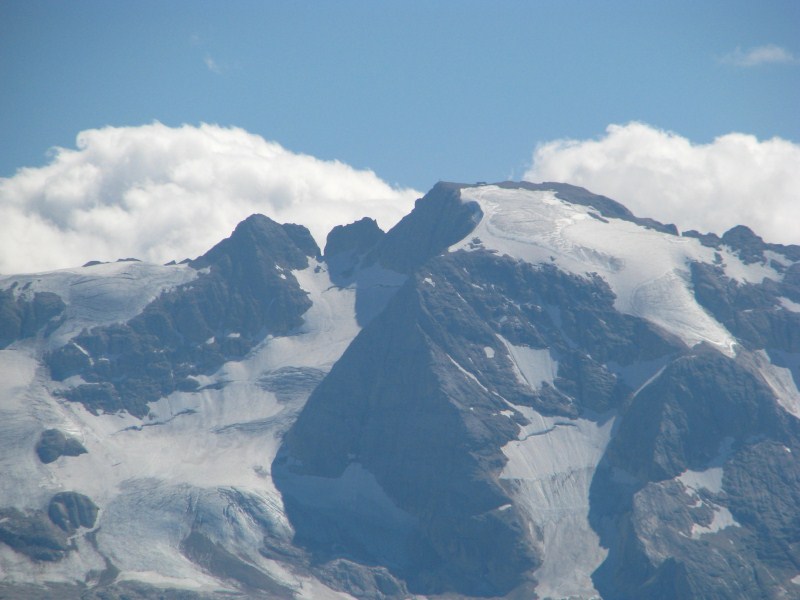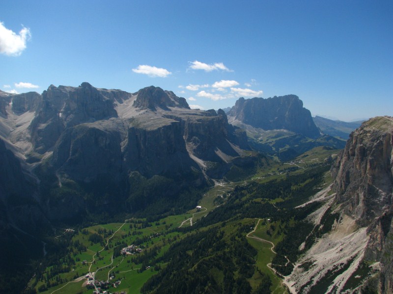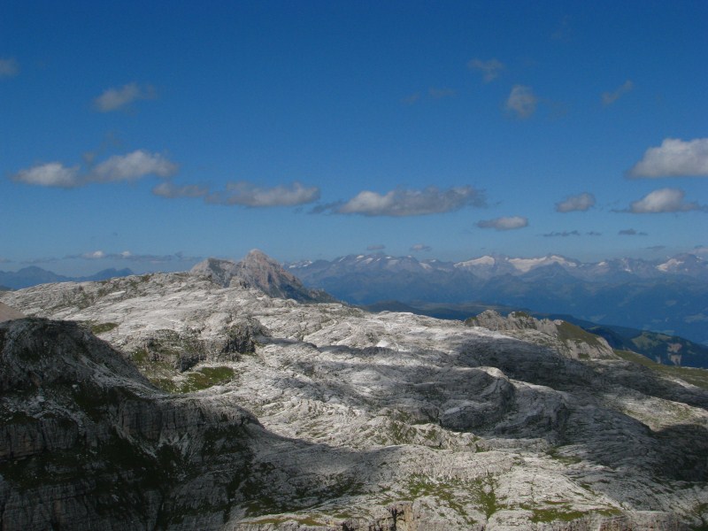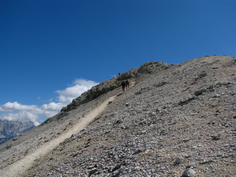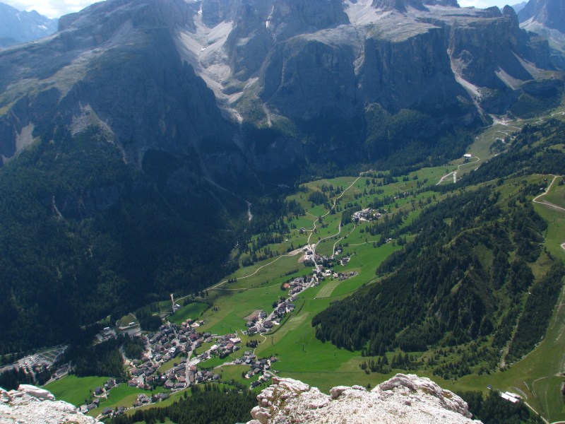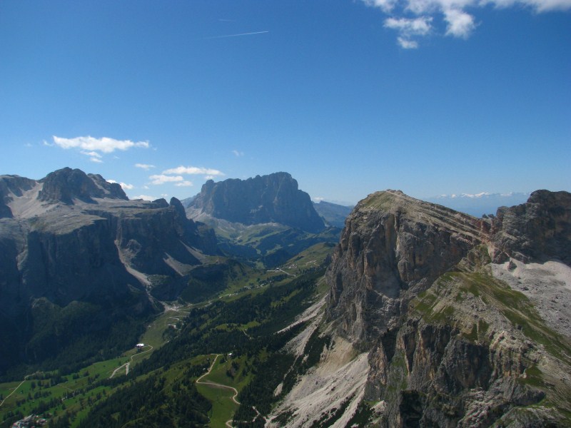 Lì Carlotta, Letizia, Francesca ed Enrico si fermano a mangiare mentre Giampaolo prosegue per la cima, il cordino in realtà supera un dislivello di soli 20 metri poi il sentiero rimane si esposto sul precipizio ma molto facile da percorrere, in breve in circa 20 minuti raggiungo i 2670 metri della Cima Sassongher, dove c’è un’enorme croce d’acciaio.