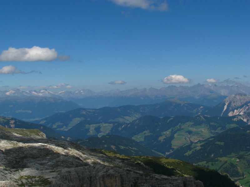 Da lì la vista è incredibile da nord a sud: Val Pusteria e cime della fascia di confine, Monte Cavallo, Tofane, Lagazuoi, Antelao, Pelmo, Civetta, Marmolada col suo ghiacciaio, Sella, Sassolungo, Ortles, Odle, Gruppo del Puez.