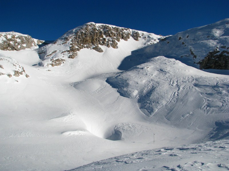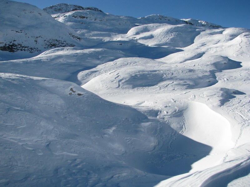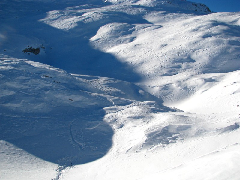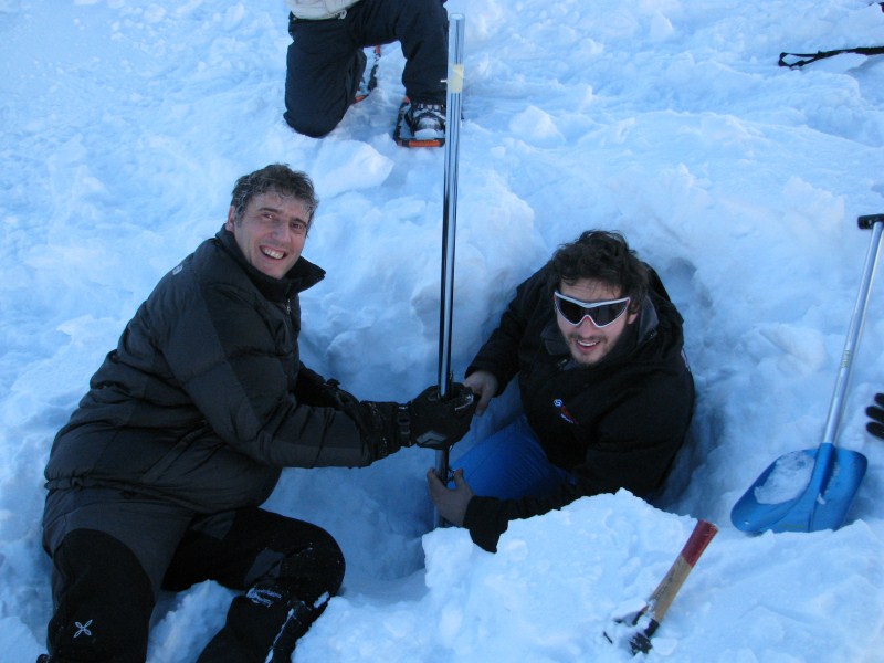 L’aria è calma (elemento determinante per l’accumulo di aria fredda), e partiamo dalla sella di outflow con -18°C per arrivare a perdere circa 1°C al metro nella discesa della conca, dove il termometro registra ben presto un -33°C per poi appoggiarlo per terra dove arriva a -38°C e poi “cessa di vivere” (parliamo di strumento non schermato ed appoggiato per terra).