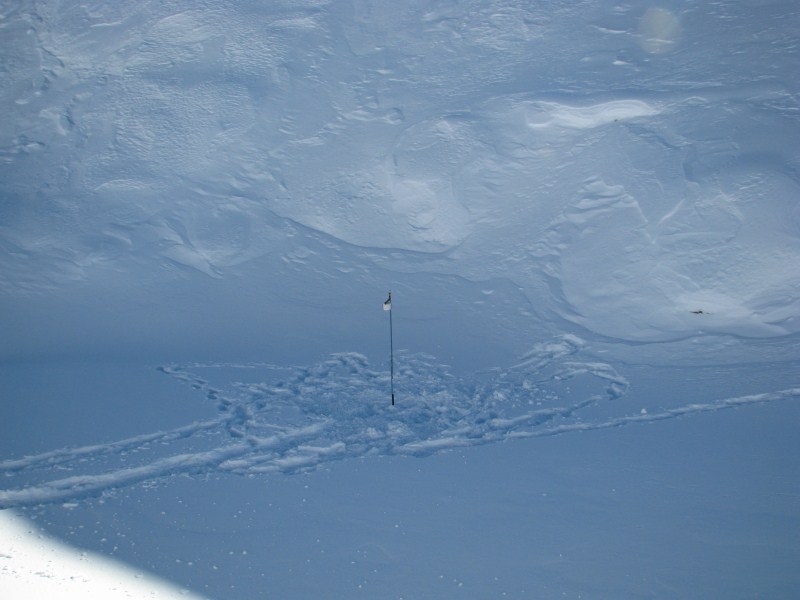 Dopo una colazione abbondante, partiamo  con un bel sole alla volta di Busa di Manna, ci fermiamo prima a recuperare gli ibutton installati la sera prima, poi arriviamo alla sella di outflow dove scarichiamo i dati dagli hobo con lo shuttle, poi scendiamo verso Busa di Manna (il vento ha trasformato, con gli accumuli eolici, il paesaggio, rispetto alla nostra visita del 28 dicembre).  Prima di arrivare al fondo ci fermiamo ad installare un nuovo Cryotemp nella dolina posta a nord ovest rispetto a Busa di Manna, dobbiamo scavare non poco per piantare il palo e fissare poi i due pali che arrivano a circa 4 metri), nella conca il freddo si fa sentire ed i miei capelli leggermente sudati a causa del colbacco, che indossavo fino a poco prima, si ghiacciano in pochi minuti dandomi un aspetto “canuto”.