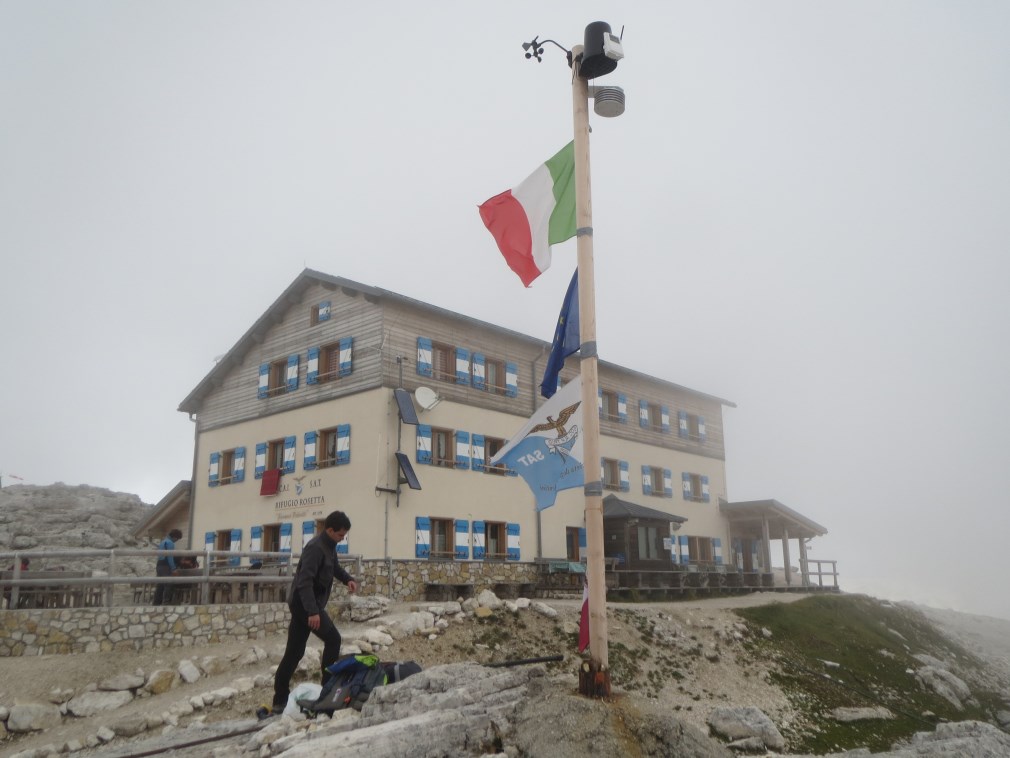 Saliti poi al Rifugio Rosetta, abbiamo spostato la stazione Meteo installata sul retro del Rifugio per posizionarla su un palo di legno alto oltre quattro metri dove ci sono le bandiere al rifugio. Durante il nostro lavoro abbiamo anche incontrato un ufficiale del Servizio Meteo dell’Aeronautica Militare di istanza a Villafranca di Verona, col quale abbiamo parlato di meteo ed osservatori meteo, interessanti le informazioni sulle loro basi a Passo Rolle e sulla Paganella.