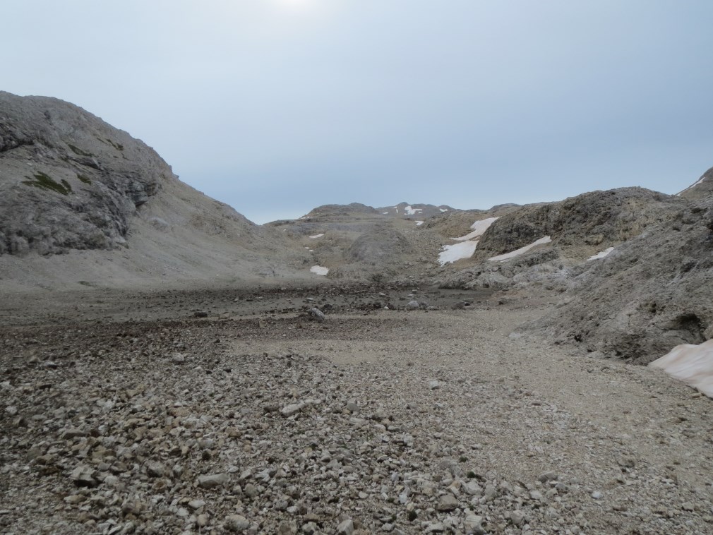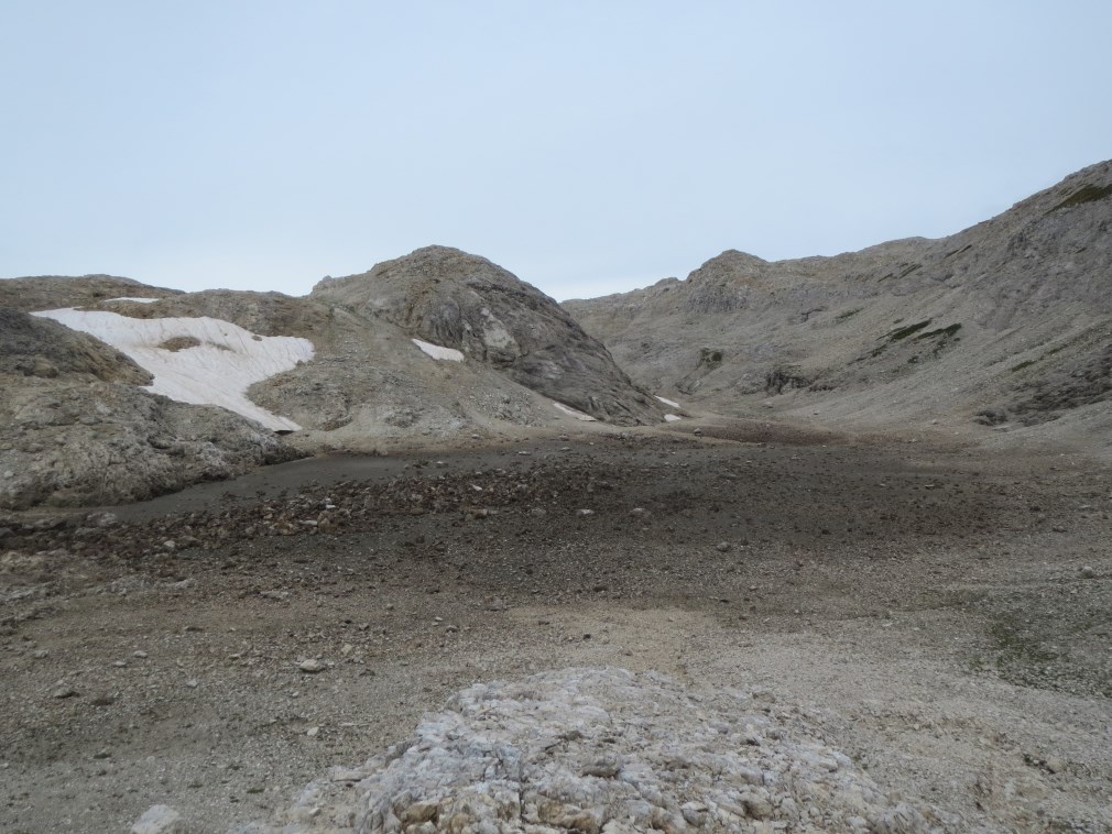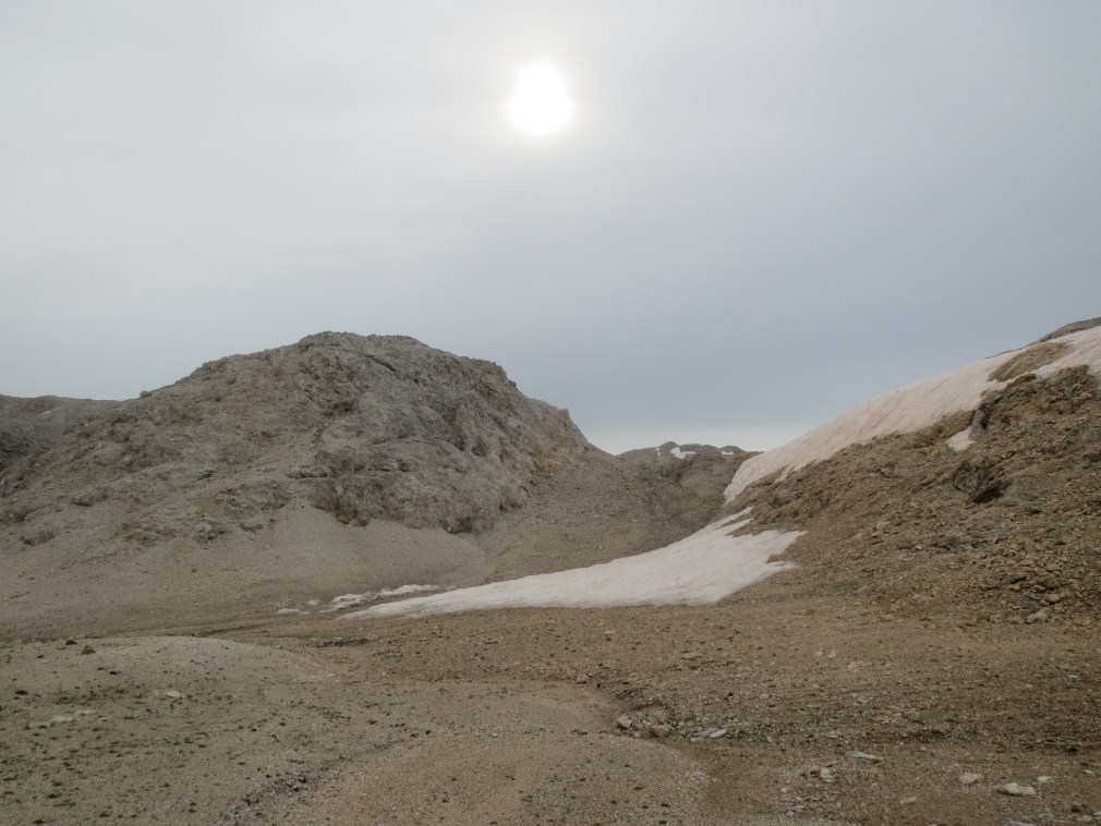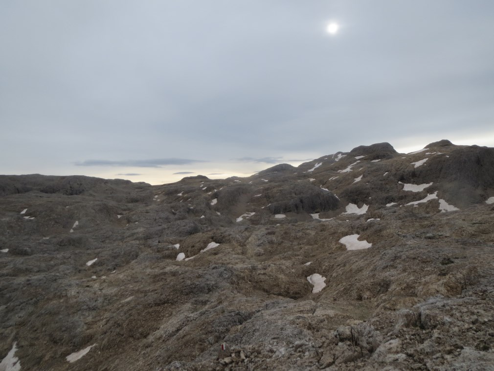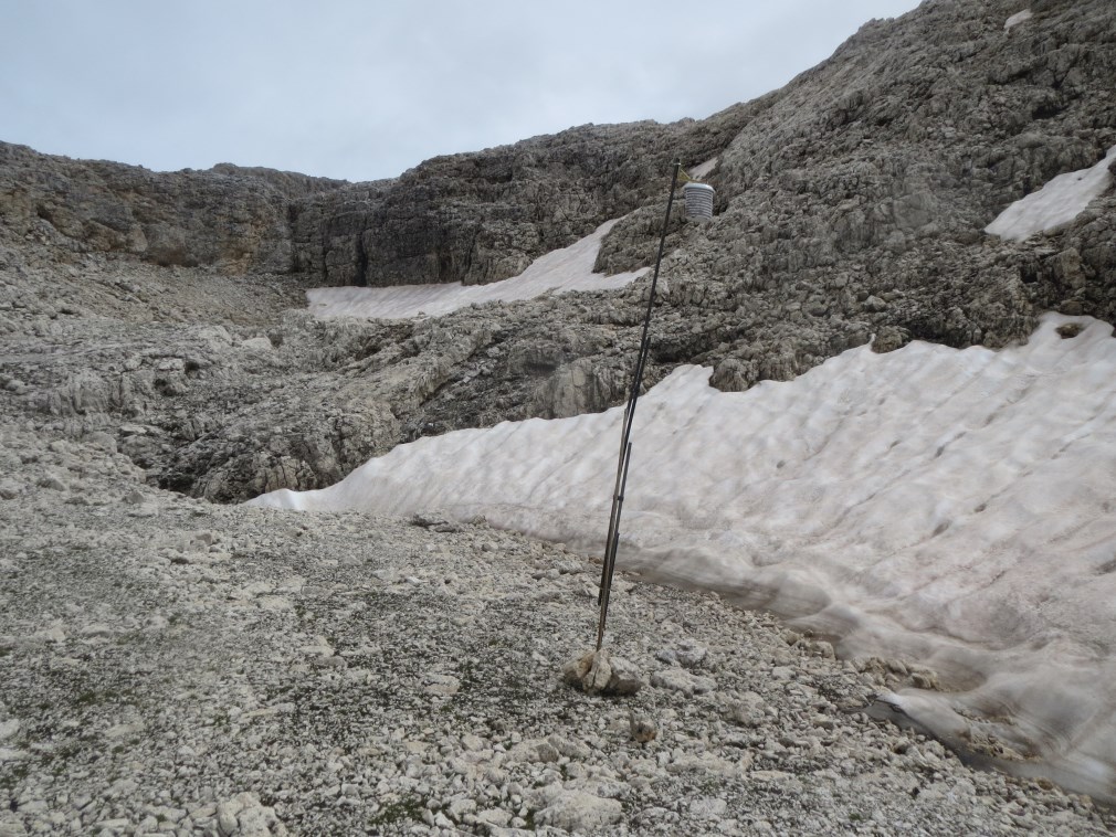 Da lì saliamo a Lago di Manna e impieghiamo una buona ora per ritrovare l’installazione di Lago di Manna Effimero, nella mia perlustrazione individuo così una nuova conca a nord est di Busa Fradusta, conca che chiamerò Busa del Miel, a quota 2614 metri, qui installeremo un Cryotemp per la prossima stagione (previo nulla osta da parte del Parco).