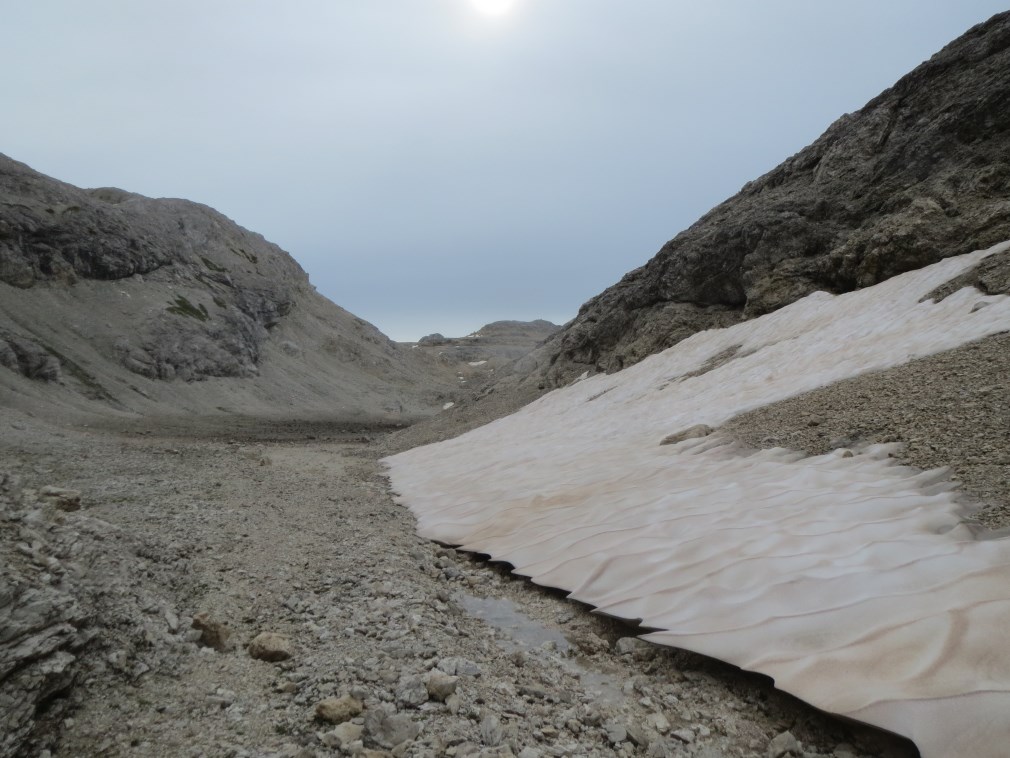 Dopo una buona cena, andiamo a letto e ci alziamo la mattina intorno alle sei, con un tempo discreto, dopo colazione partiamo alla volta del “giro delle doline”. Saliamo a Busa di Roda a raddrizzare i pali e inserire il nuovo sensore per la stagione 2014/2015, scendiamo poi alla Sella per fare lo stesso lavoro e poi saliamo nel Paradiso lunare di Riviera di Manna, che ogni volta mi lascia a bocca aperta.