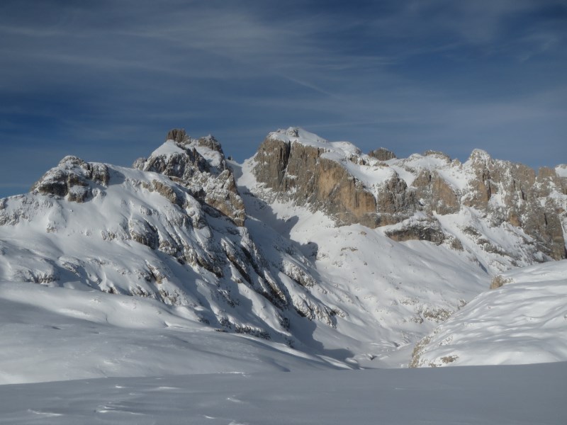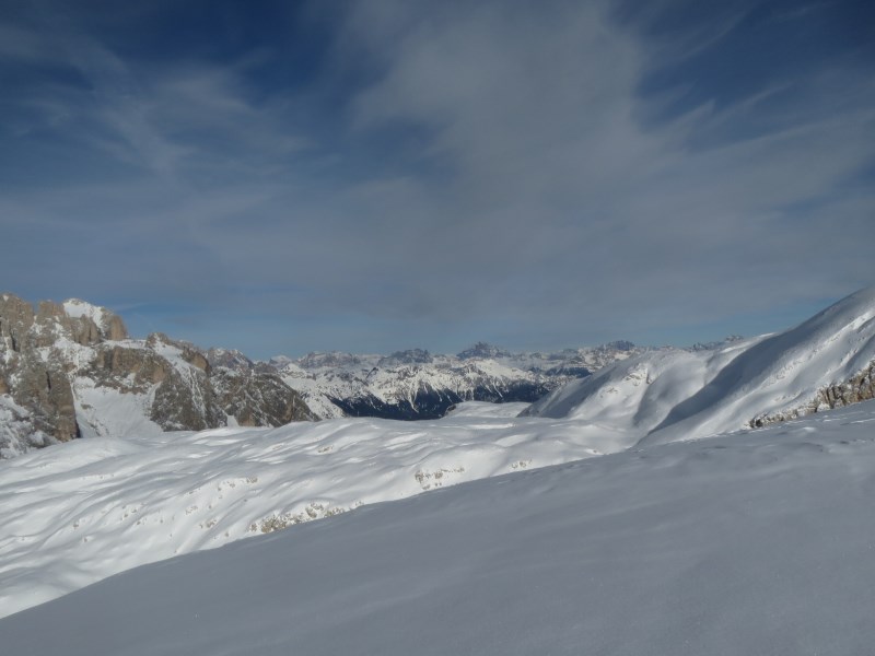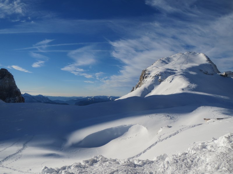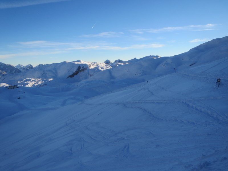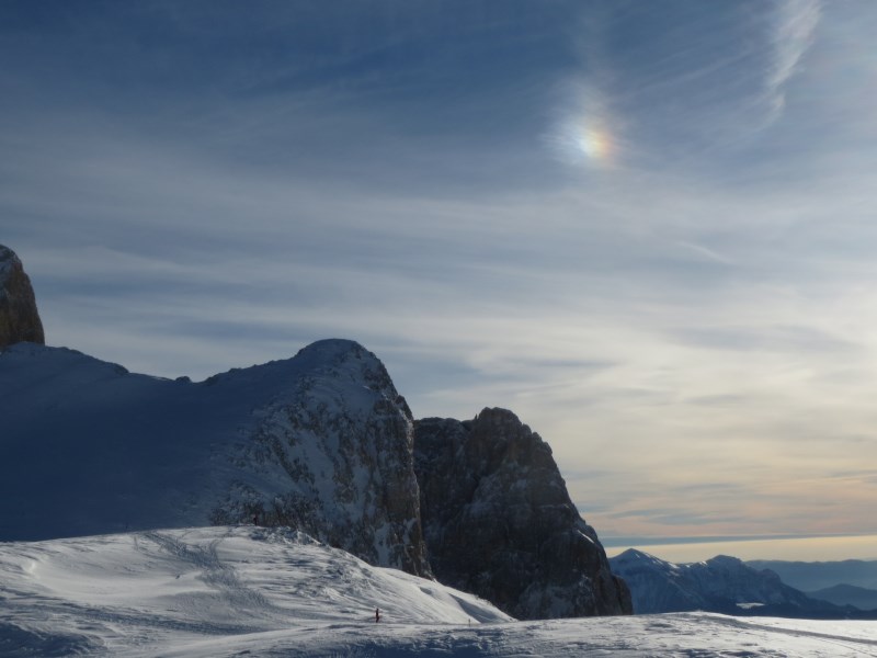 Prendiamo la prima funivia che sale al Rosetta e alle 08.50 poco prima che sorga il sole al Rifugio Pedrotti, riusciamo a provare l'esperienza della discesa nella dolina sotto il rifugio, partenza a -11°C e in pochi metri arriviamo a -38°C, una vera emozione.