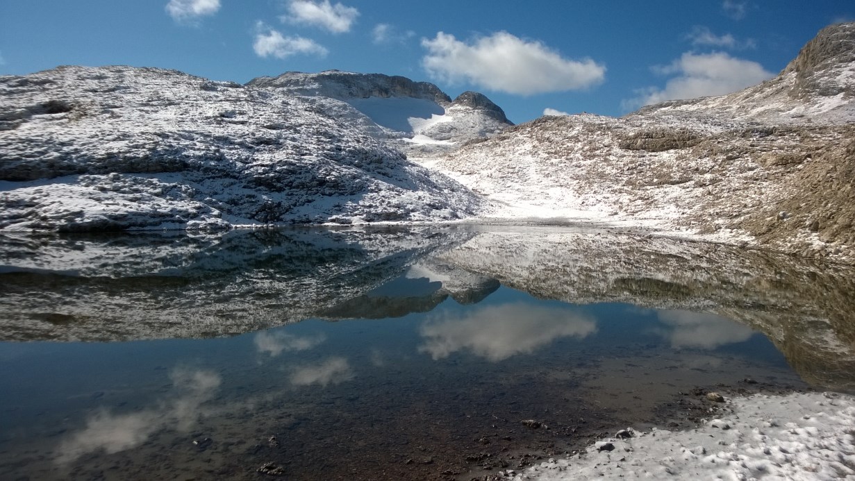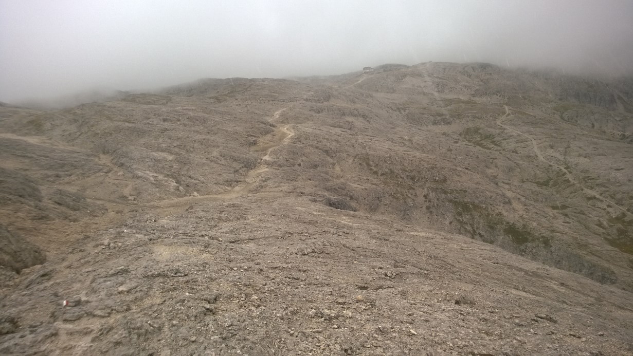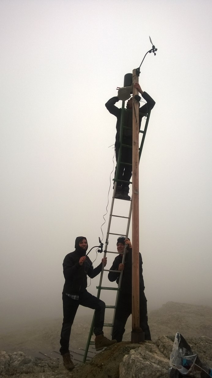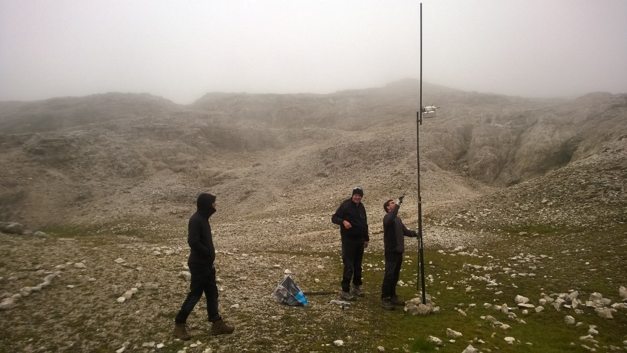 Giornata di sabato dedicata a sistemare la stazione meteo al Rifugio Rosetta e ad una breve escursione fino al sito freddo di Busa di Roda, il tutto sotto una pioggia intermittente e dei graupel.