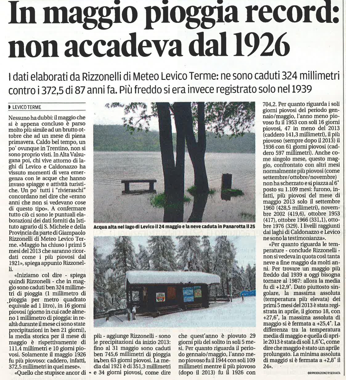 Articolo che riassume un mese di maggio piovosissimo, così come i primi 5 mesi del 2013. Entrambe le foto sono state scattate da Giampaolo Rizzonelli il 24/05 (piena sul lago di Levico) il 25/05 ( nevicata eccezionale in Panarotta).