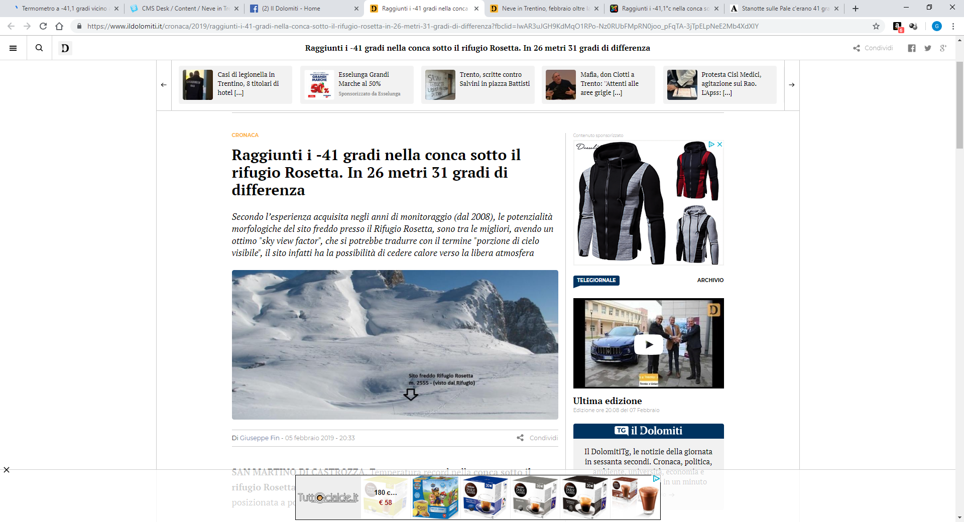 Raggiunti i -41 gradi nella conca sotto il rifugio Rosetta. In 26 metri 31 gradi di differenza