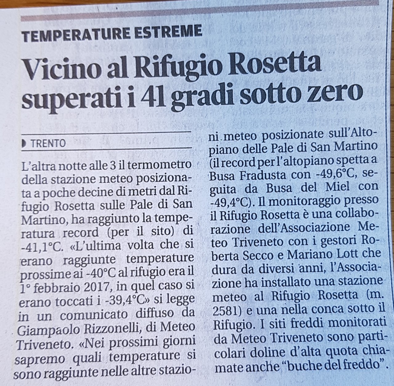 Articolo relativo ai -41°C rilevati nella conca sotto il Rifugio Rosetta il 5 febbraio 2019
