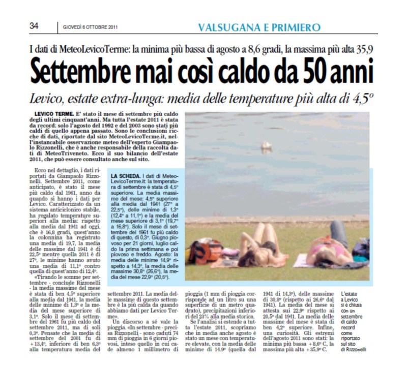 Invito a leggere l'articolo uscito sul quotidiano Trentino (vedi sezione rassegna stampa), nonché quello uscito su La Finestra in distribuzione in questi giorni, il primo parla del caldo settembre appena trascorso il secondo analizza l'estate appena chiusa ed in particolare il mese di agosto.