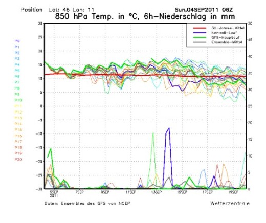 Ieri sera attendevo le precipitazioni ma i temporali non sono "arrivati" a Levico Terme, (temporali in Val di Non e Rendena), questa mattina tempo variabile con schiarite, poi dopo le 15.00 è iniziato a piovere, e sono caduti 8,7 mm. Intanto dopo la pioggia che dovrebbe cadere domani i modelli fisico matematici (vedi allegato) prevedono bel tempo almeno fino al 12 settembre e temperature comunque sempre sopra media.