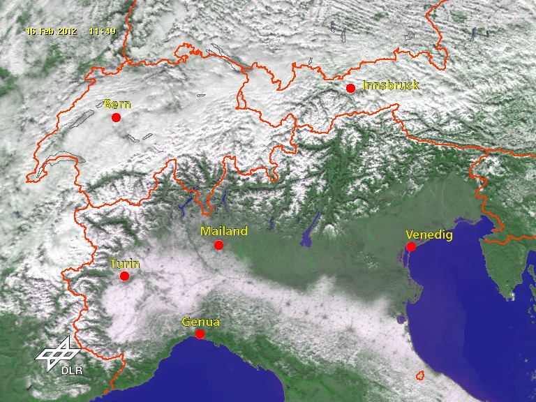 Posto qui sotto anche una spettacolare immagine satellitare di oggi, nella quale si vede benissimo la situazione dell'innevamento sulle Alpi ma soprattutto su Piemonte, parte della Lombardia, Emilia Romagna, ma soprattutto si vede lo scarso anzi inesistente innevamento dei fondovalle alpini e della pianura veneta.