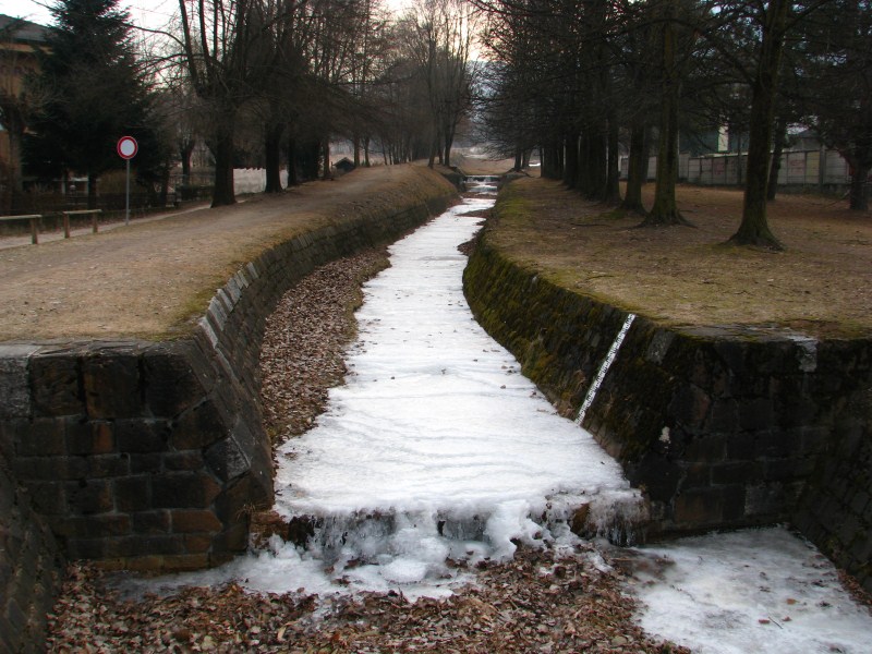Un paio di foto del lago di Levico ghiacciato, del Rio e del nevischio a Levico Terme.
