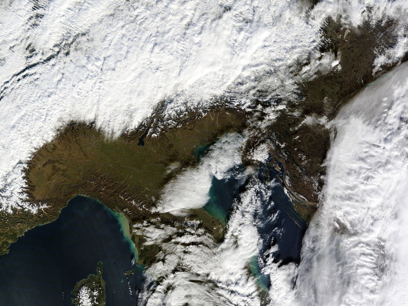 Qui sotto oltre alla foto del muro del foehn fotografato dalla Kaiserjagerstrasse anche la foto del satellite di questa mattina che mostra la barriera opposta dalle Alpi.
