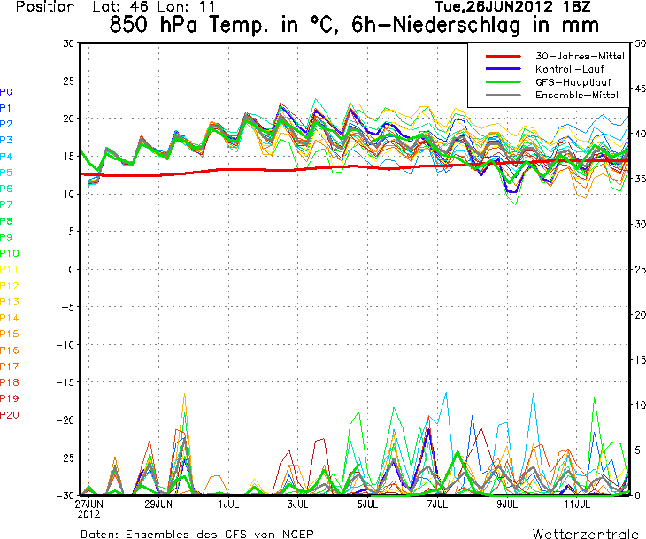 Dai modelli qui allegati si vede chiaramente la temperatura in aumento. Nel modello riportante la cartina geografica, con la previsione al 2 luglio si vede in "rosso" la "bolla calda" che parte dall'Africa fino ad arrivare a nord delle Alpi, mentre nell'altro modello "spaghetti" nel grafico superiore sono riportate le temperature previste ad una quota di circa 1500 metri, notevole l'aumento di temperatura previsto, da notare come queste siano superiori alla media dell'ultimo trentennio.