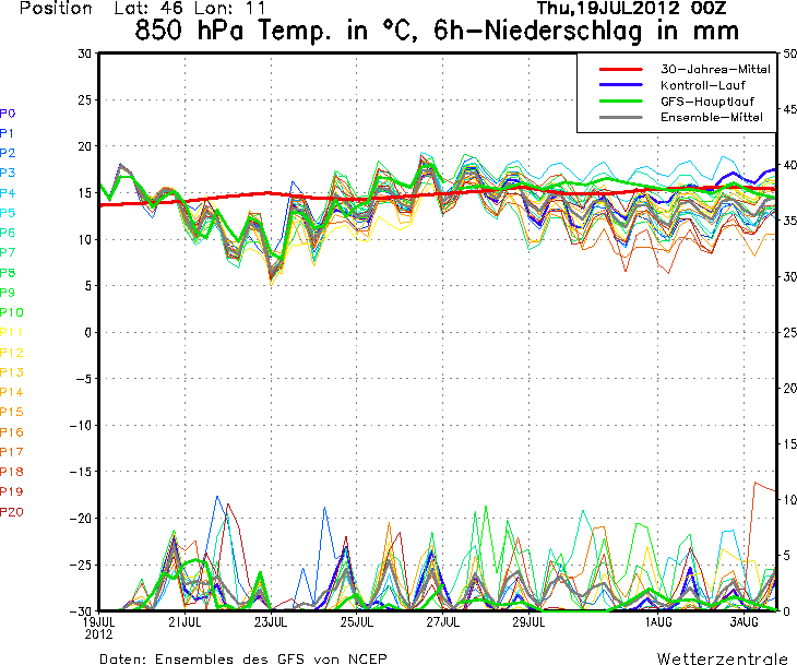 Domenica dovrebbe già migliorare ma le temperature seguito il passaggio perturbato e l'arrivo di aria fredda da nord sono destinate ad essere più basse specie in quota (vedi qui sotto il modello fisico matematico GFS, precipitazioni grafico inferiore, temperature a 1500 metri circa grafico superiore).