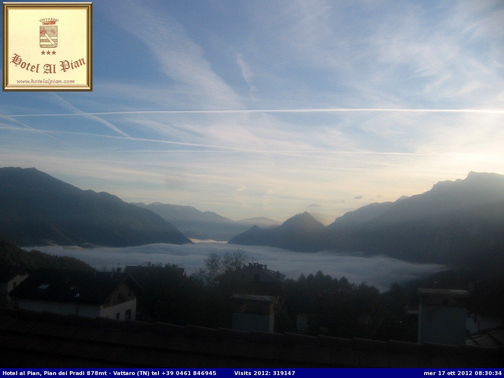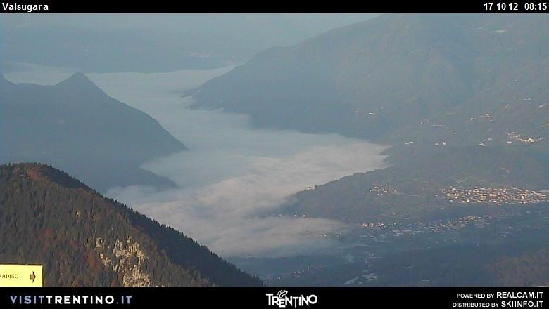 L'immagine ripresa dalla webcam dell'hotel Al Pian di Pian dei Pradi è eloquente e mostra la nebbia che incombe questa mattina sulla Valsugana. Anche la webcam di Visit Trentino dagli impianti del Brocon mostra la nebbia da Borgo verso Levico.