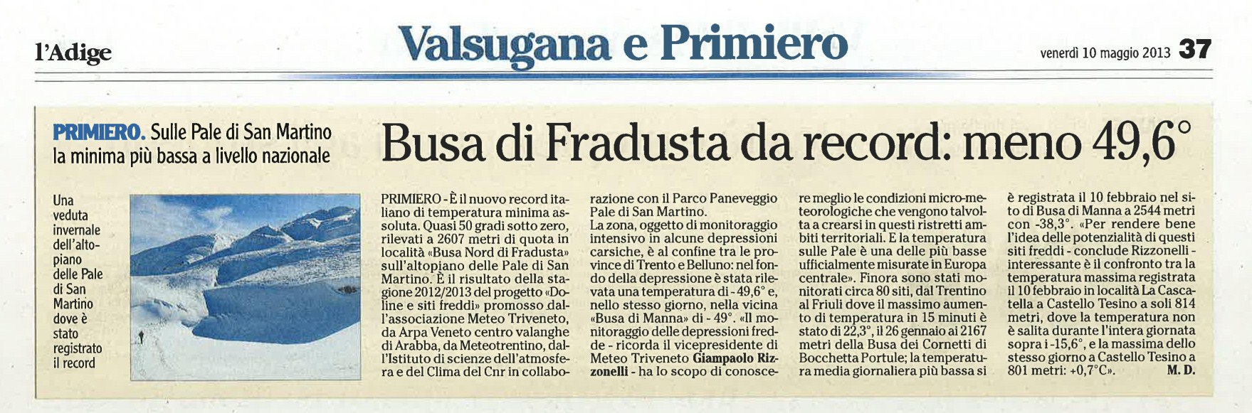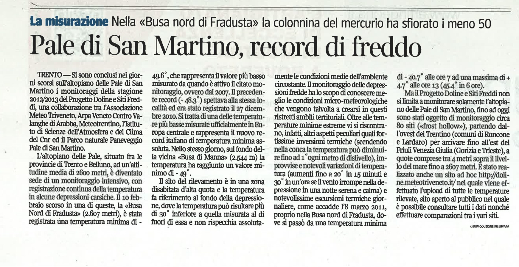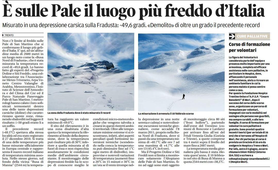 Allego qui in calce il comunicato stampa predisposto in data odierna per comunicare la fine della stagione di monitoraggi 2012/2013 del progetto doline e siti freddi, al quale partecipa anche Meteo Levico Terme con diversi siti monitorati (Manderiolo, Busa Verle, Inghiaie ecc...) e di cui sono responsabile per l'Associazione Meteo Triveneto, progetto che ha visto rilevare quest'anno il nuovo record di temperatura minima assoluta con -49,6°C.