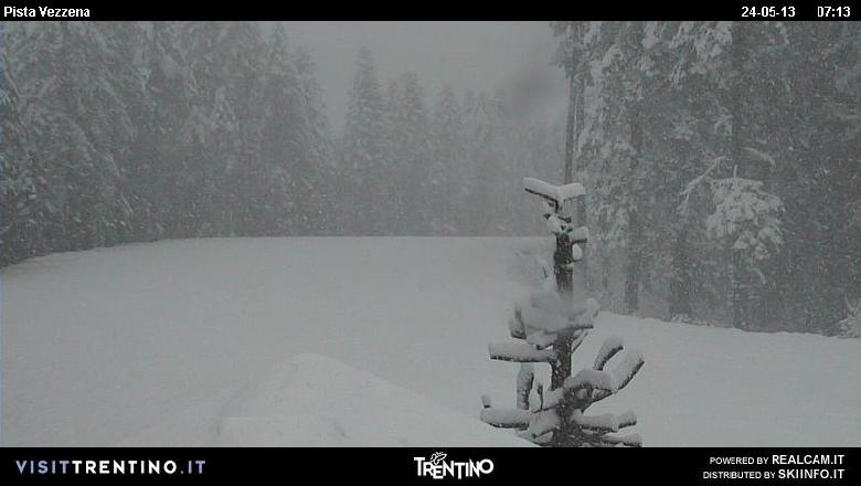 Dopo la massima di ieri arrivata a +24,4°C, la temperatura alla mezzanotte di ieri era già a +8,3°C, mentre questa mattina alle ore 07.30 siamo già a +3,8°C. Quota neve che è andata via via scendendo, fino agli 850 metri di questa mattina (vedi foto della webcam di Pian dei Pradi questa mattina). Nevica un po' in tutto il Trentino, da Predazzo a Bedollo. Un altro scatto qui sotto ritrae la situazione in Vezzena questa mattina. Alle ore 08.15 qualche fiocco in mezzo alla pioggia anche a Levico Terme.