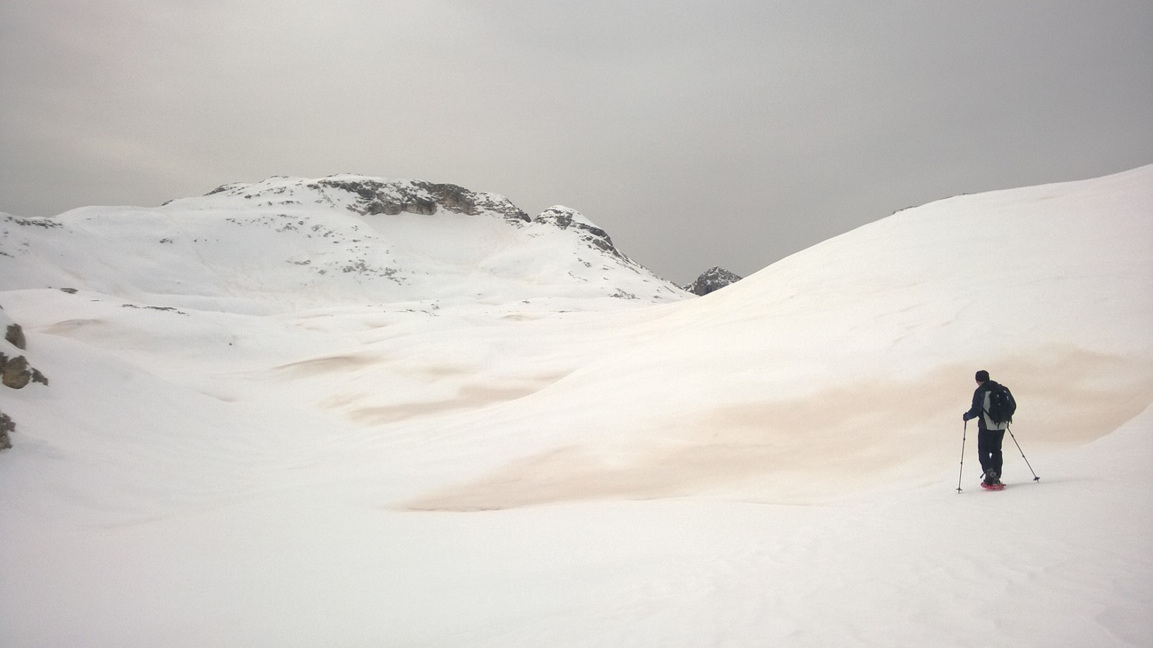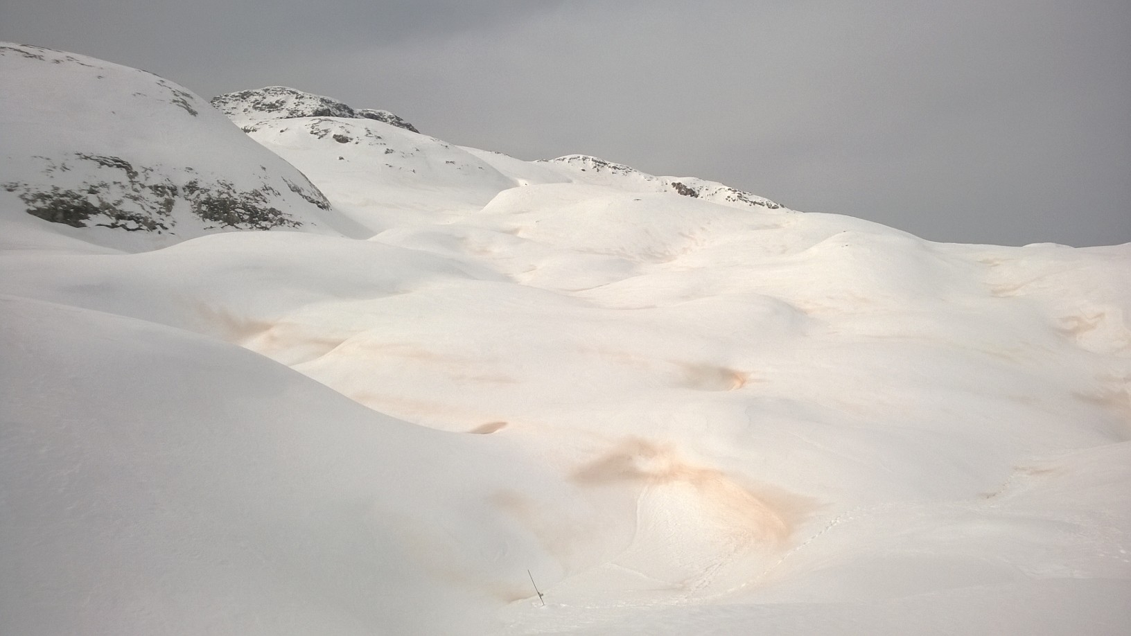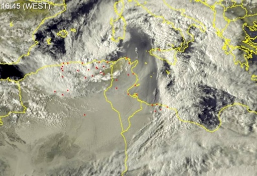 Qui allegato una foto satellitare del 22 marzo in cui si vede chiaramente la sabbia che dalla Tunisia sale verso nord, mentre le altre foto le ho scattate domenica 3 aprile sulle Pale di San Martino e si vedono chiaramente le "macchie" di sabbia sulla neve.