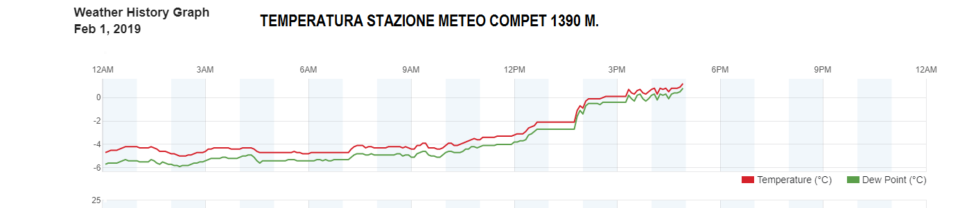 Notevole l'aumento termico in quota, alla stazione meteo del Compet, si è passati da una minima di -6,2°C ad una massima di +1,3°C con pioggia quindi anche lì.