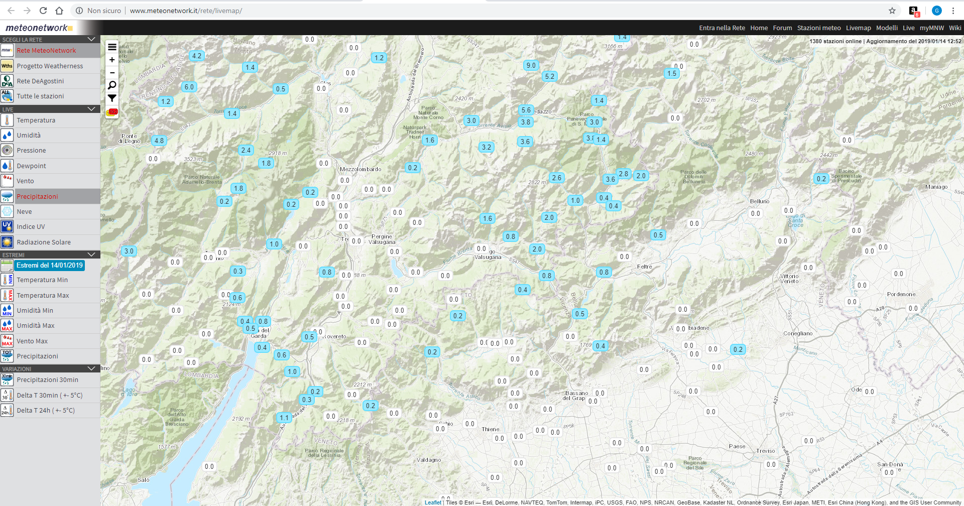 In tabella 1 la mappa con le precipitazioni (poche) in Trentino questa mattina.