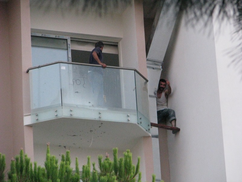La sera prima di andare a cena sono riuscito a fotografare un muratore che insieme ad una squadra di operai stanno realizzando una nuova ala dell’hotel, alla faccia di tutte le norme di sicurezza (caschetti, guanti, cinture ecc… inesistenti) era al 5° piano fuori dal balcone appoggiato ad un tubo non ancorato che tentava di mettere a posto una condotta dell’aria condizionata, campione del mondo 2011 dell’insicurezza sul lavoro. Tra l'altro ci verrà comunicato in seguito che la settimana scorsa uno dei muratori è precipitato dal cantiere, no comment.