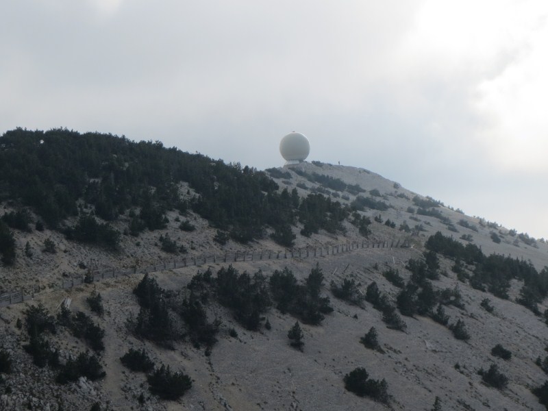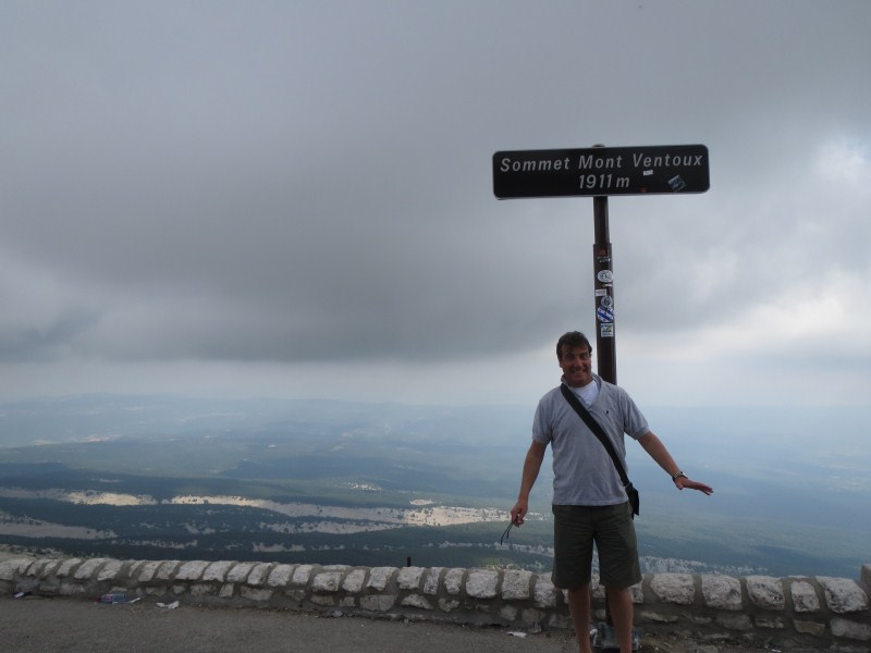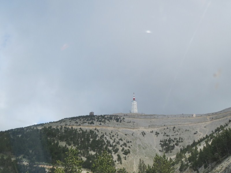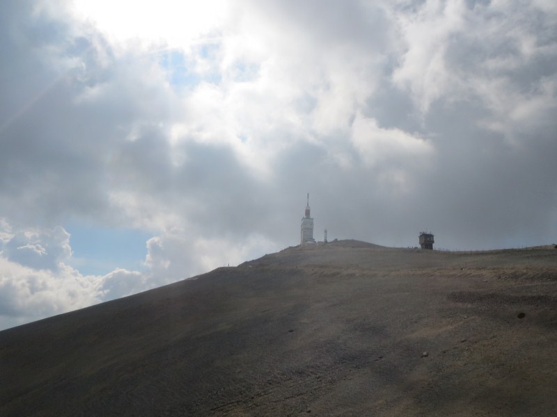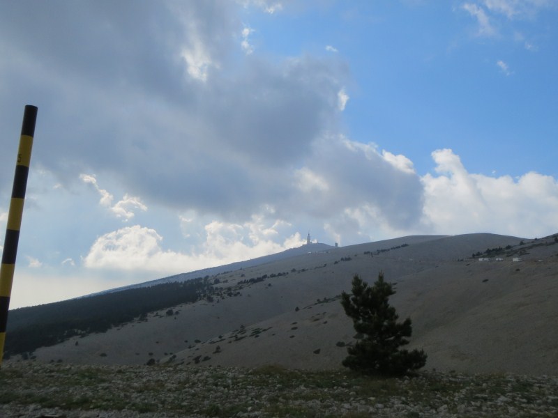 Dopo aver lasciato il castello di Barroux iniziamo la salita del Mont Ventoux, alto 1911 metri, un posto incredibile, un paesaggio lunare, in cima gli ultimi 300 metri sono privi di vegetazione, a causa del vento, qui il Maestrale “tira” anche 130 giorni l’anno con raffiche fino a 250 km orari (il record se ben ricordo fu di 313 km/h). In cima ci sono un sacco di ciclisti che si fotografano per ricordo. Sulla cima c’è una mega torre per le tele e radio comunicazioni.