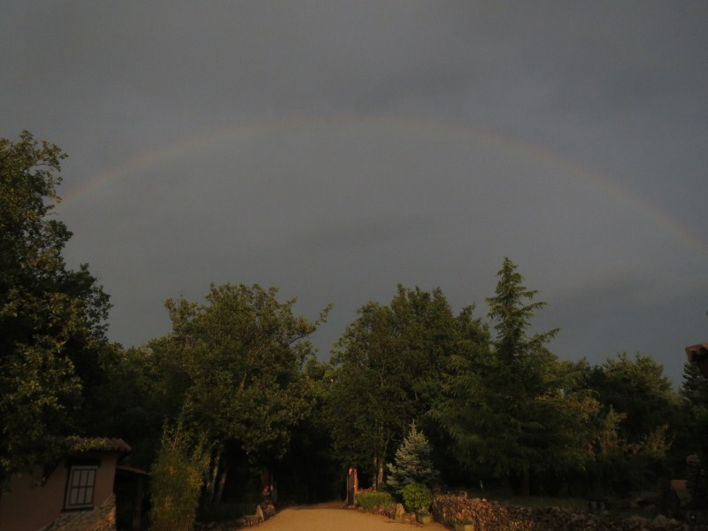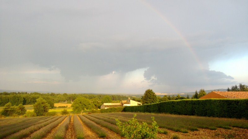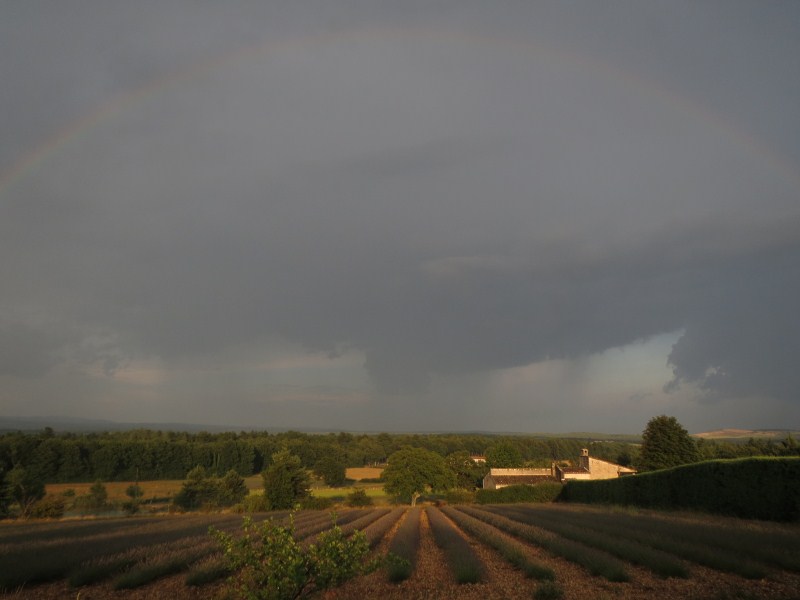 Finito il temporale, pioviggina ancora e possiamo ammirare un tramonto favoloso, con l'arcobaleno ed i campi di lavanda.