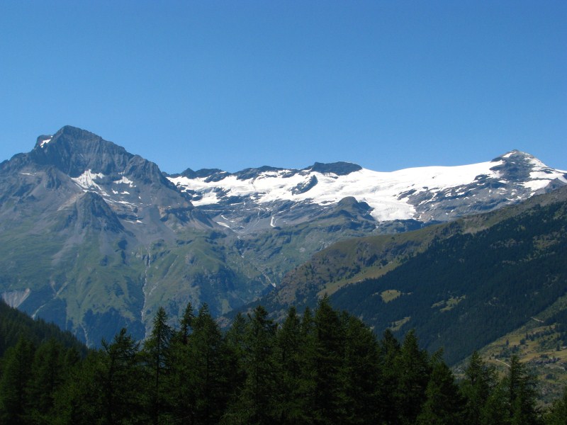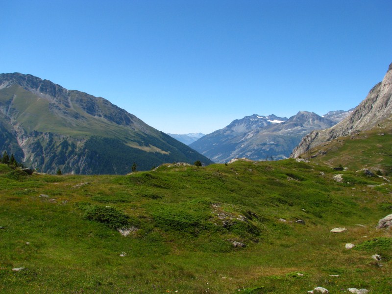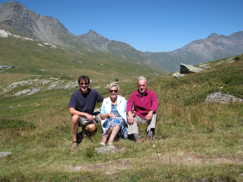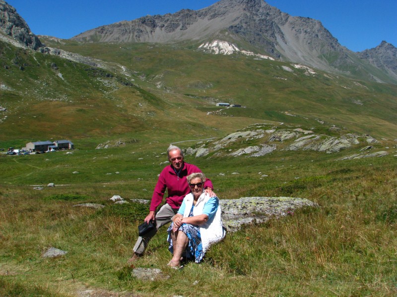 Proseguiamo a piedi fino a circa quota 2250 metri, ci sono molti escursionisti e facciamo conoscenza di una signora (le chiediamo di scattarci qualche foto), una professoressa di Lione che ha una casa a Sardières/Sollières sotto Lanslebourg, ci racconterà che anche il marito è professore, due figli laureati in diritto (uno avvocato, uno ispettore delle Imposte) e due ricercatori (uno a Parigi ed uno a Nizza Sophia Antipolis, quest ultimo in partenza per un anno in Arabia Saudita con moglie – sposata una settimana prima della partenza per evitare rogne) insomma una famiglia di “secchioni”.