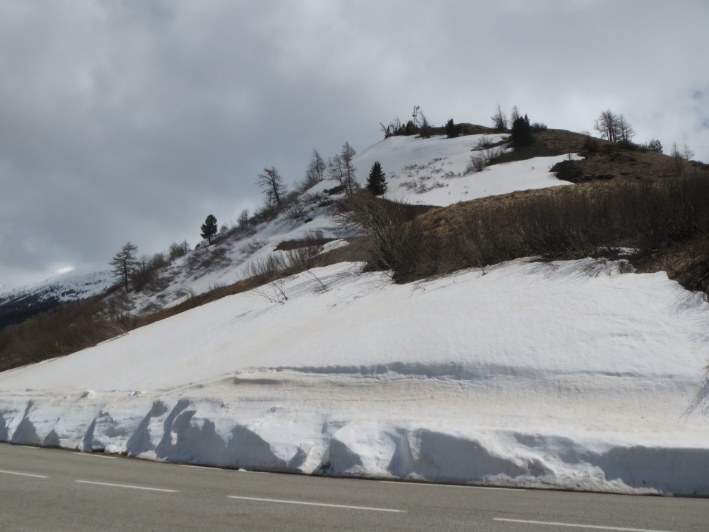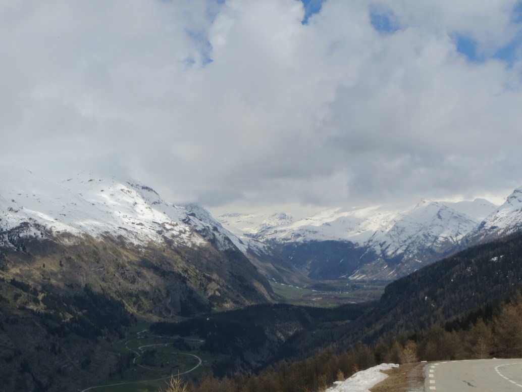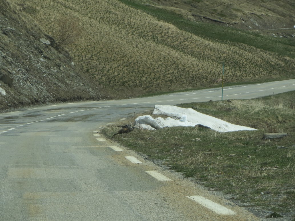 C'è ancora molta neve (meno di un anno fa quando era passato il Giro d'Italia), appena passato il valico devo frenare bruscamente per evitare una marmotta che attraversa la strada, ne vedrò almeno 40 prima di entrare in Italia.