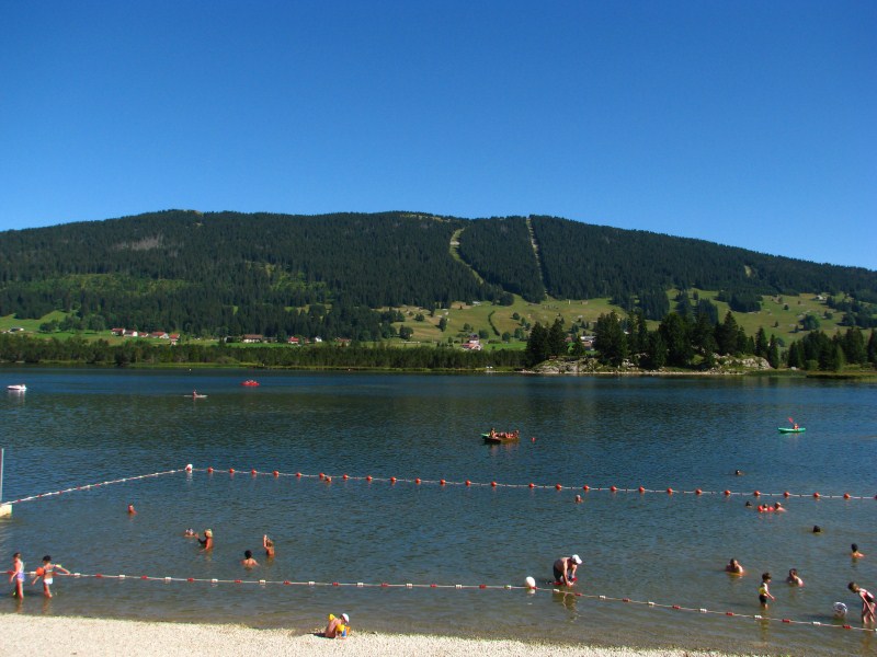 Scendiamo in paese con la cabinovia alle ore 14.30, salutiamo l’albergatrice dell’Hotel du Centre e partiamo alla volta della Svizzera, tutti i 155 km che percorreremo saranno ad una quota compresa tra i 900 ed i 1200 metri, altipiani bellissimi e disabitati. A metà strada circa mi fermerò a fare il bagno nel lago di Rousses (lac des Rousses) posto a quota 1050 metri circa, l’acqua vicino alla riva ha una temperatura di 23°C ma entrando di un centinaio di metri (la profondità è davvero esigua) la temperatura è molto più bassa (sui 21°C).