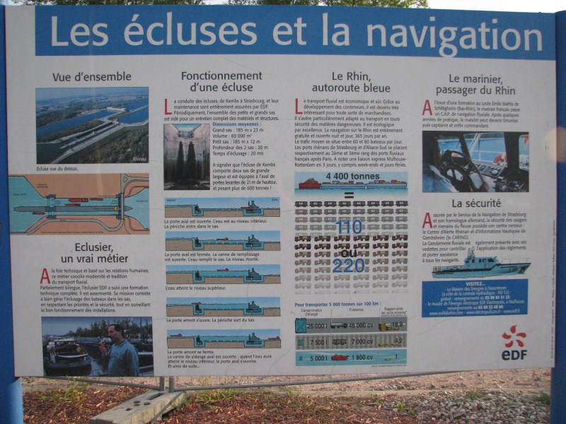 Sul confine Francia Germania ci fermiamo a guardare la spettacolare diga EDF costruita sul Reno e soprattutto le complesse chiuse che regolano la navigazione sul Reno. Resto più di 20 minuti a guardare un’enorme chiatta che entra nel Reno dove è più alto di livello (a sud , a valle) vengono chiuse le paratie, e svuotata la chiusa, la chiatta scende così di circa 15 metri di livello (vedi foto), poi viene aperta la paratia a nord e la chiatta può proseguire la navigazione verso nord.