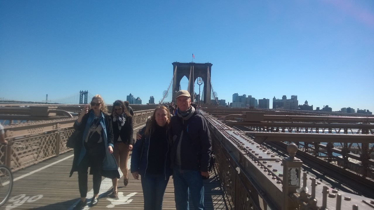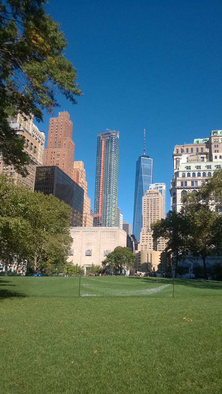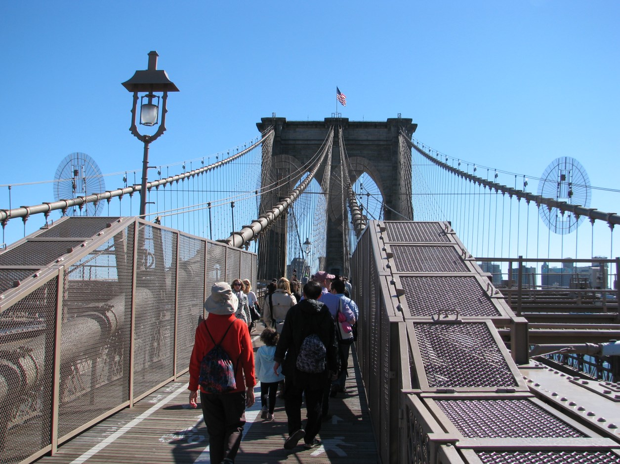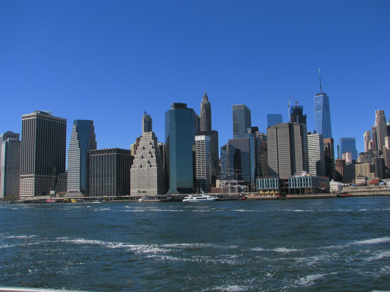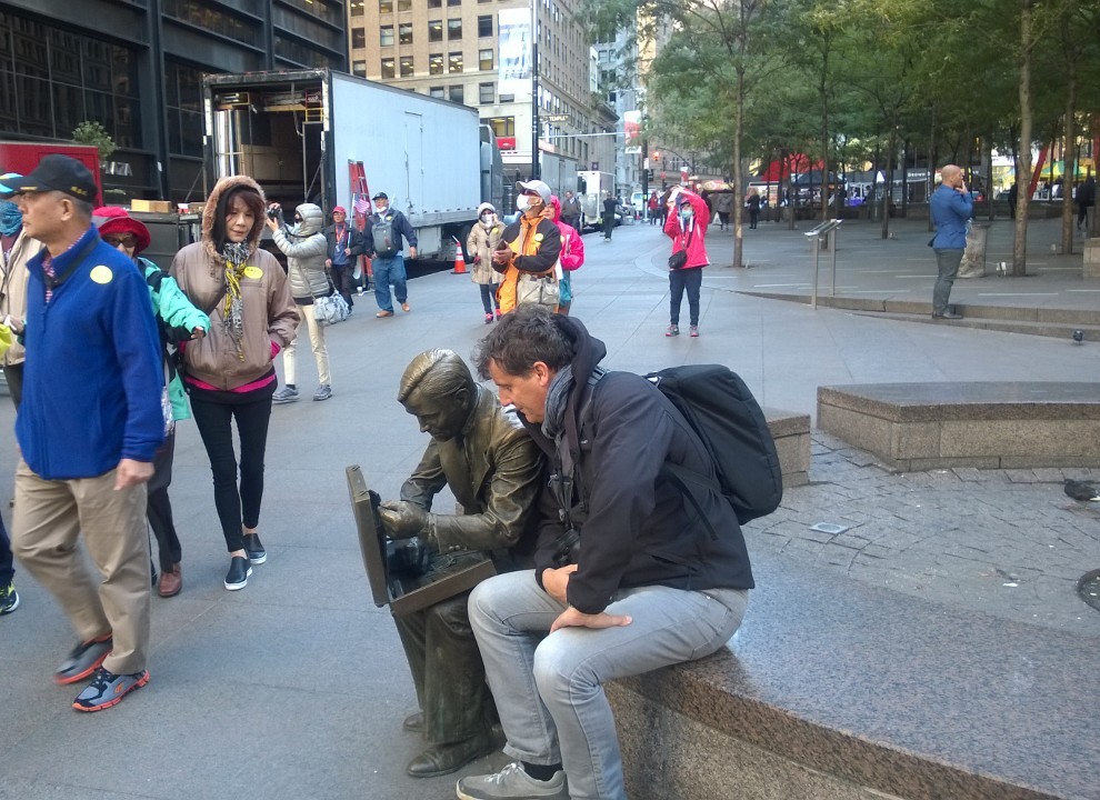 Ci svegliamo alle 08.00 con un bel sole che colpisce i grattacieli davanti al nostro hotel, dopo la colazione prendiamo la metro E e scendiamo fino al World Trade Center. L'aria è frizzante (10°C) e un po' ventosa, scendiamo a piedi fino a Battery Park e "scopriamo" che oggi è il Columbus Day, giornata festiva per gli USA, che celebrano la scoperta dell'America da parte di Cristoforo Colombo, lo scopriamo perché la coda di persone che vogliono andare a vedere la Statua della Libertà è eterna. Decidiamo pertanto di prendere solo i biglietti e di tornare domani. Ci avviamo a piedi a Wall Street e da lì raggiungiamo le rive dell'East River, facciamo due chiacchere con una signora cinese che protesta per la repressione cinese nei confonti degli aderenti al Falun Gong (una disciplina spirtuale che prevede la meditazione e l'educazione basata su principi di verità, tolleranza e compassione. Gli aderenti sono stati spesso torturati e addirittura utilizzati come banca degli organi. Proseguiamo fino al Ponte di Brooklyn che attraversiamo insieme a migliaia di persone (nota di colore: sul ponte sono vietati lucchetti e cuffiette, 100 usd di multa per chi li attacca alle ringhiere del ponte), in effetti sabato in TV abbiamo visto un servizio su questi lucchetti che rischiano di rovinare il ponte.