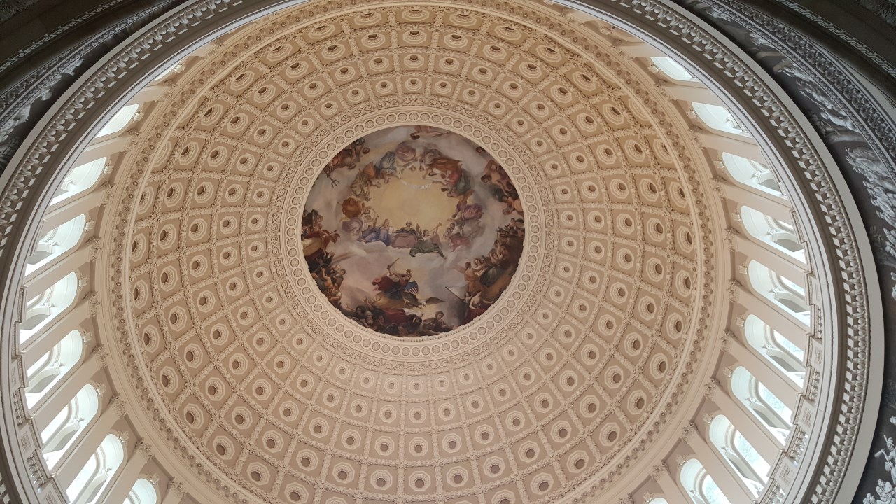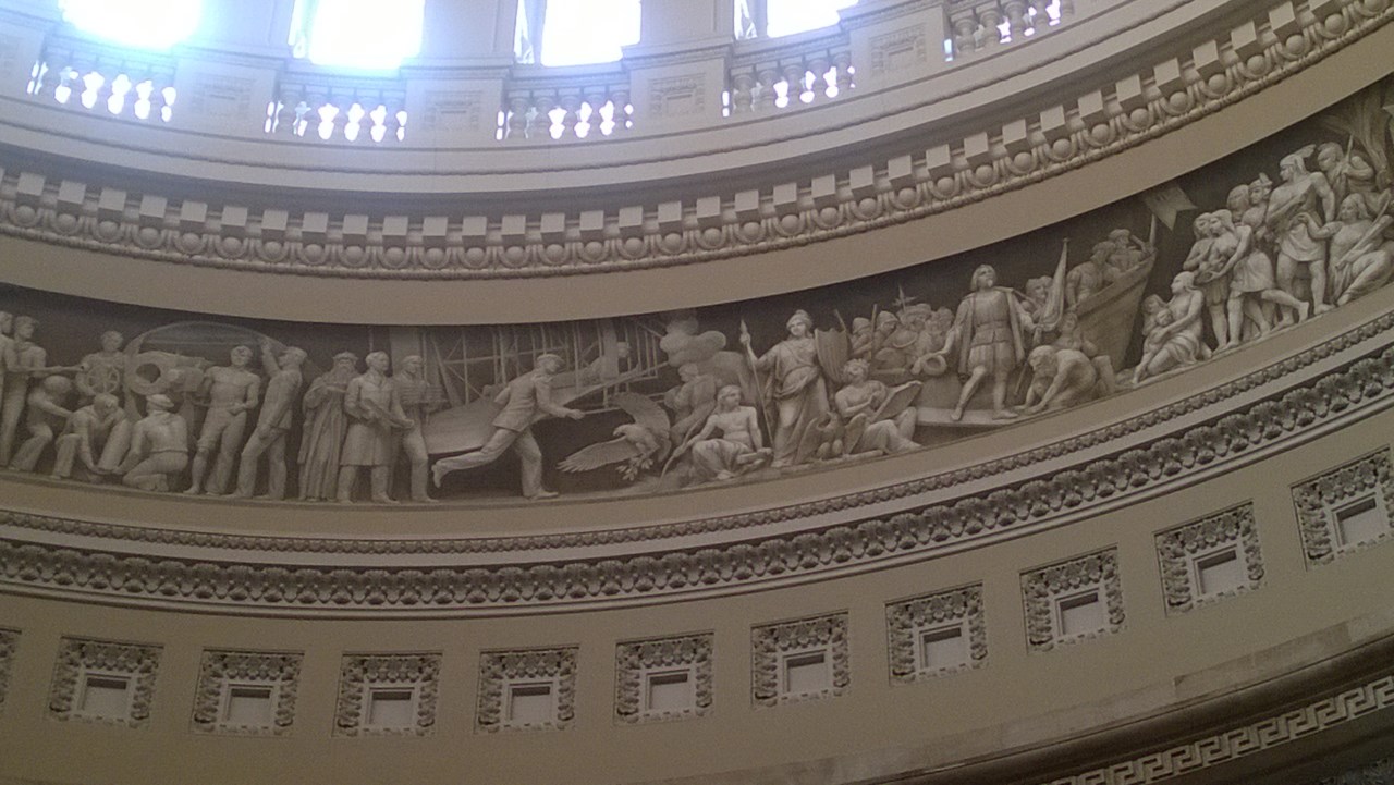 Ci facciamo portare a Capitol Hill, dove visitiamo il Campidoglio, all'entrata ci sono ampie misure di sicurezza compreso un bellissimo labrador nero con una pettorina con scritto "i'm not a pet" che annusa tutti quanti. La polizia è in tenuta da antisommossa. Non si possono portare oltre che ovviamente bombe ed armi :-) anche liquidi o cibo, Francesca si ostina a voler far entrare due "pericolosissimi" fagottini al cioccolato, verrà bloccata fatta uscire a gettare il cibo e rientrare, zio ken.