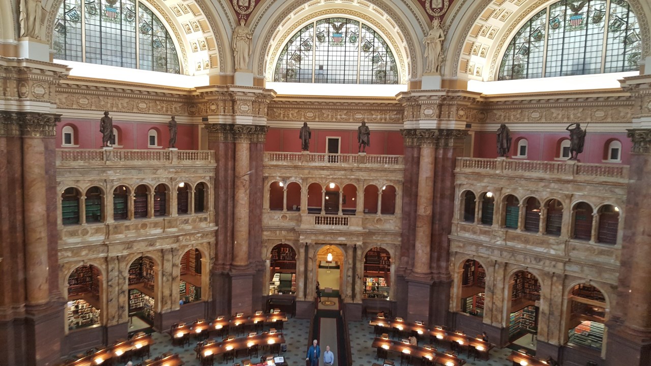 Terminata la visita guidata, tutto sotto terra, in corridoi di marmo pulitissimi, raggiungiamo la libreria del Congresso, che con i 158 milioni di documenti ospitati è la più grande libreria al mondo. Vediamo anche una delle tre Bibbie stampate da Gutenberg.