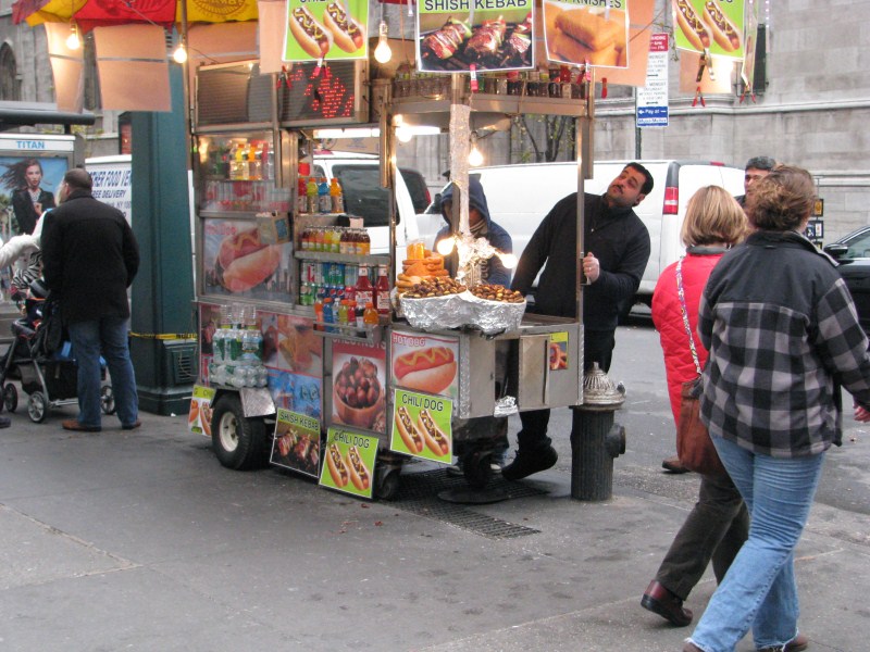 Facciamo colazione “fuori da Tiffany” mangiando un ottimo hot dog con senape.