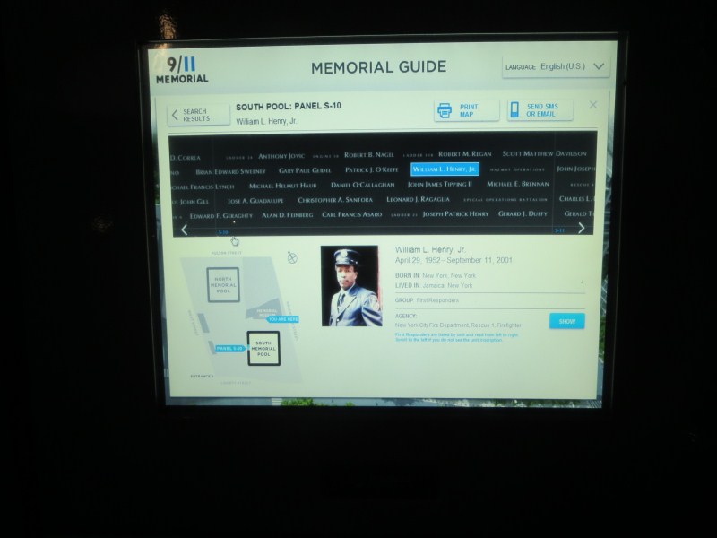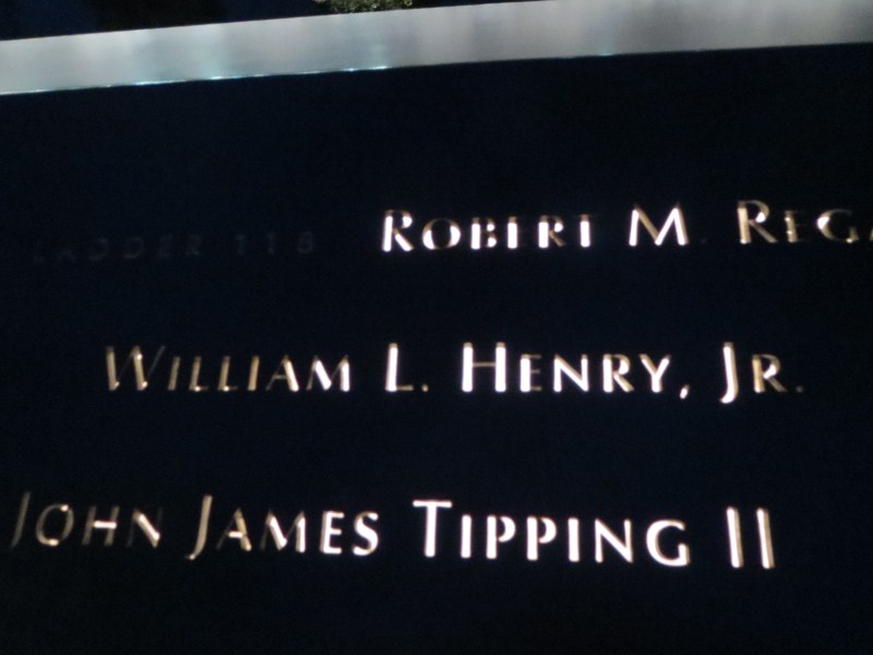 Scesi dal Rockfeller Center, pranziamo da Hale & Hearty, da lì dopo una foto dall’interno alla famosa pista di pattinaggio al Rockfeller Center, prendiamo la metro e scendiamo fino a Ground Zero (tra l’altro realizzo oggi che la polizia vista l’altro giorno, compresa la Swat e poi anche l’esercito, era conseguenza dell’omicidio occorso l’altro giorno a Time Square), dove mi separo da Francesca per visitare il Memorial dell’11 settembre 2001. L’emozione è fortissima nel vedere il luogo di così tanta tristezza, ricordi legati ai fatti dell’11 settembre 2011 ovviamente, non ho prenotato la visita, ma è possibile farlo sul posto, non si paga per entrare ma è consigliata una donazione, inizio la visita alle 16.30 dopo aver fatto il consueto controllo documenti. La visita al memorial ti coinvolge, non so come ma mi viene in mente il nome di uno dei vigili del fuoco morti nelle Torri l’11 settembre 2001 (ne sono morti 343 quel giorno), avevo notato il suo nome alla caserma dei pompieri del 1°distretto due giorni fa, la lapide commemorativa della caserma agli 11 morti di quella caserma era stata dedicata presumo dalla moglie al pompiere William Henry, cerco allora il nome nei computer a lato del memorial e lo trovo, da lì si può anche stampare una cartina che indica dove trovare il nome inciso nel memoriale, cosa che faccio per poi raggiungere la scritta incisa nel memoriale, la cosa mi lascia un po’ scosso.