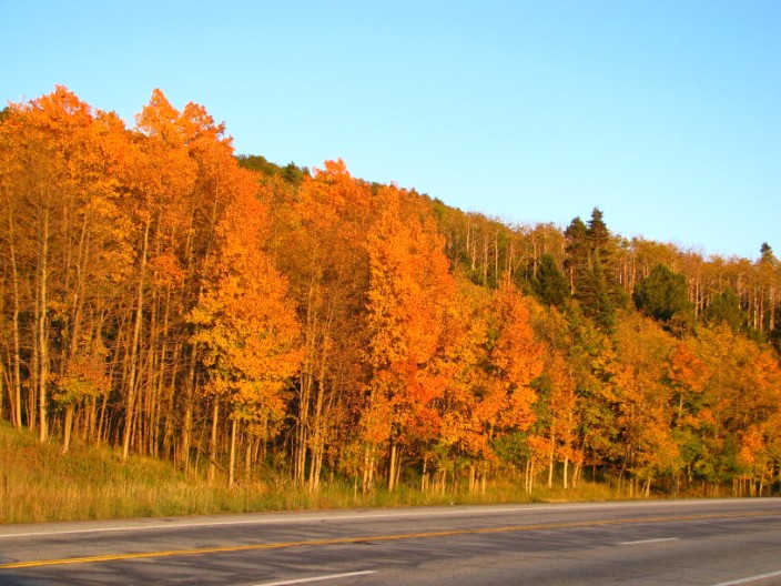 Partiamo poi verso sud passando da Pueblo, scendiamo dai 1800 metri di Manitou fino a quota 1400 metri dove la temperatura raggiunge i +27°C,  poi la strada pian piano sale fino a 2000 metri, infine svoltiamo poi a destra e saliamo fino al La Veta Pass a quota 2870 metri dove la temperatura è a +8°C, li godiamo di un bel tramonto sulle montagne e sugli alberi in particolare betulle di un colore bellissimo.